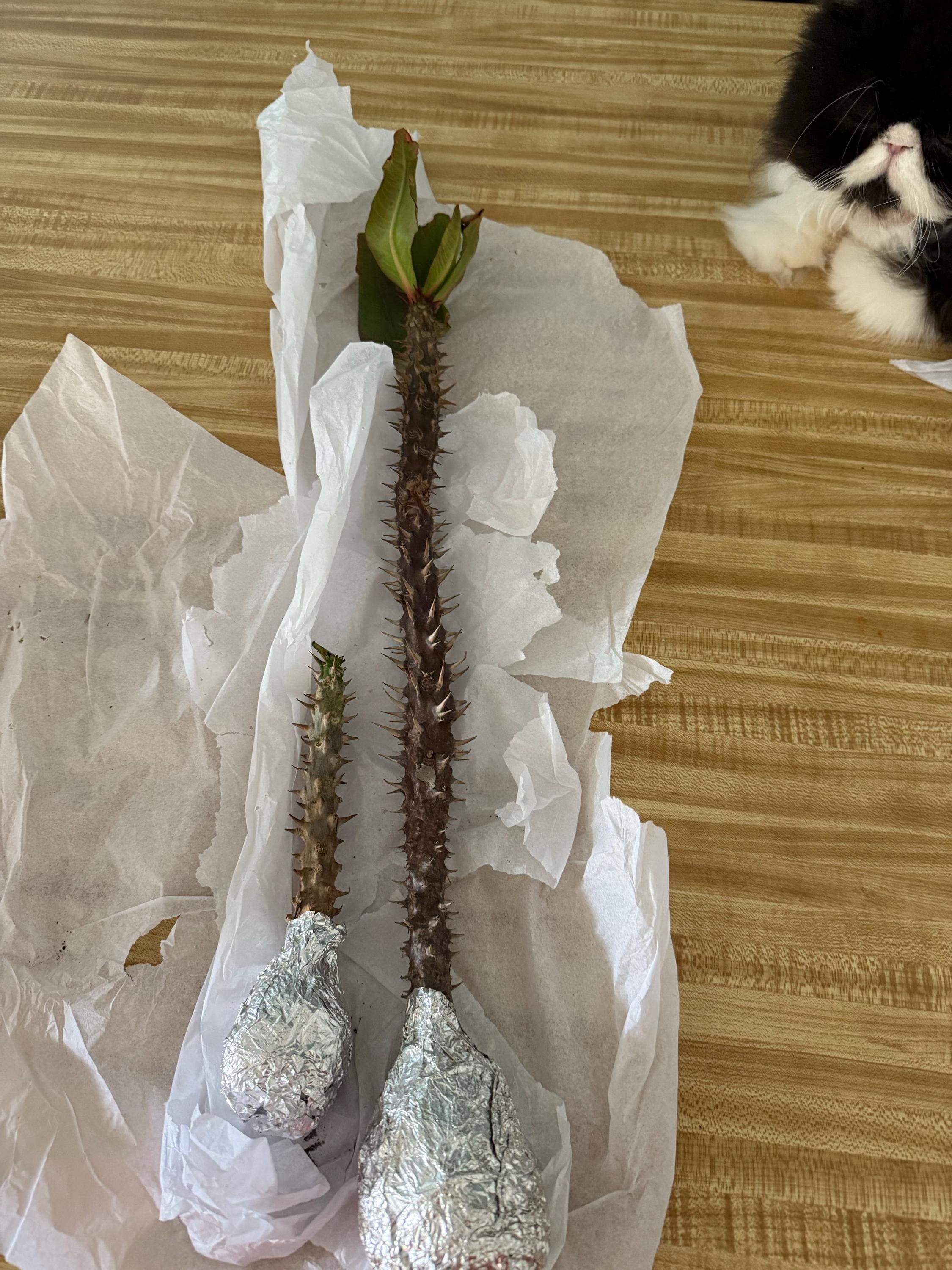 Beautiful Crown of Thorns with Large blooms. You will receive 12-16in OR LARGE plant with bare roots and some soil. This plant is drought tolerant. Full sun is needed, Use a well-draining potting mix containing perlite, and/or pine bark, soil must be drained before planting and weekly watering during hot weather.