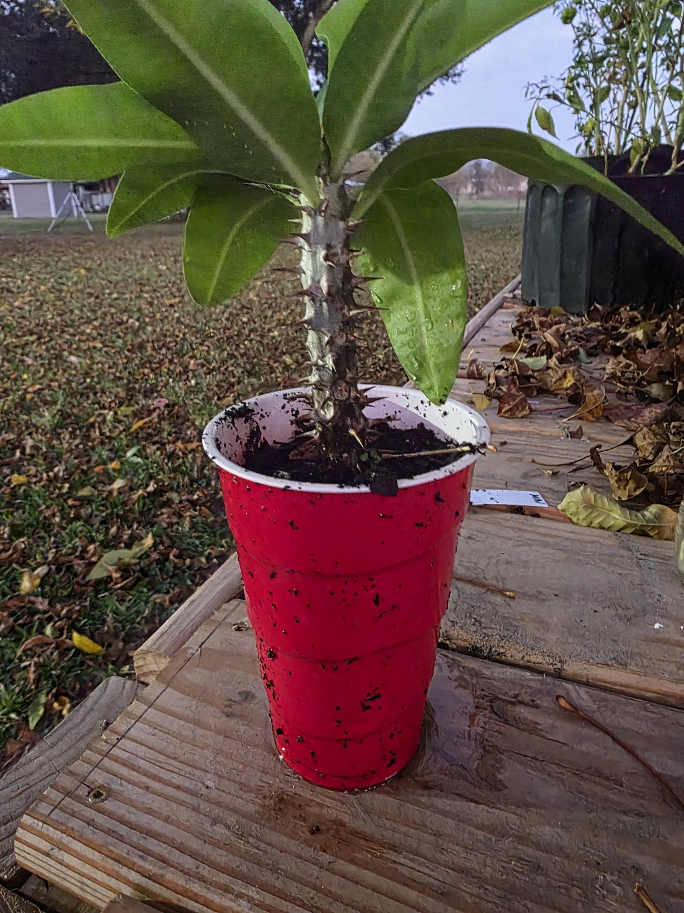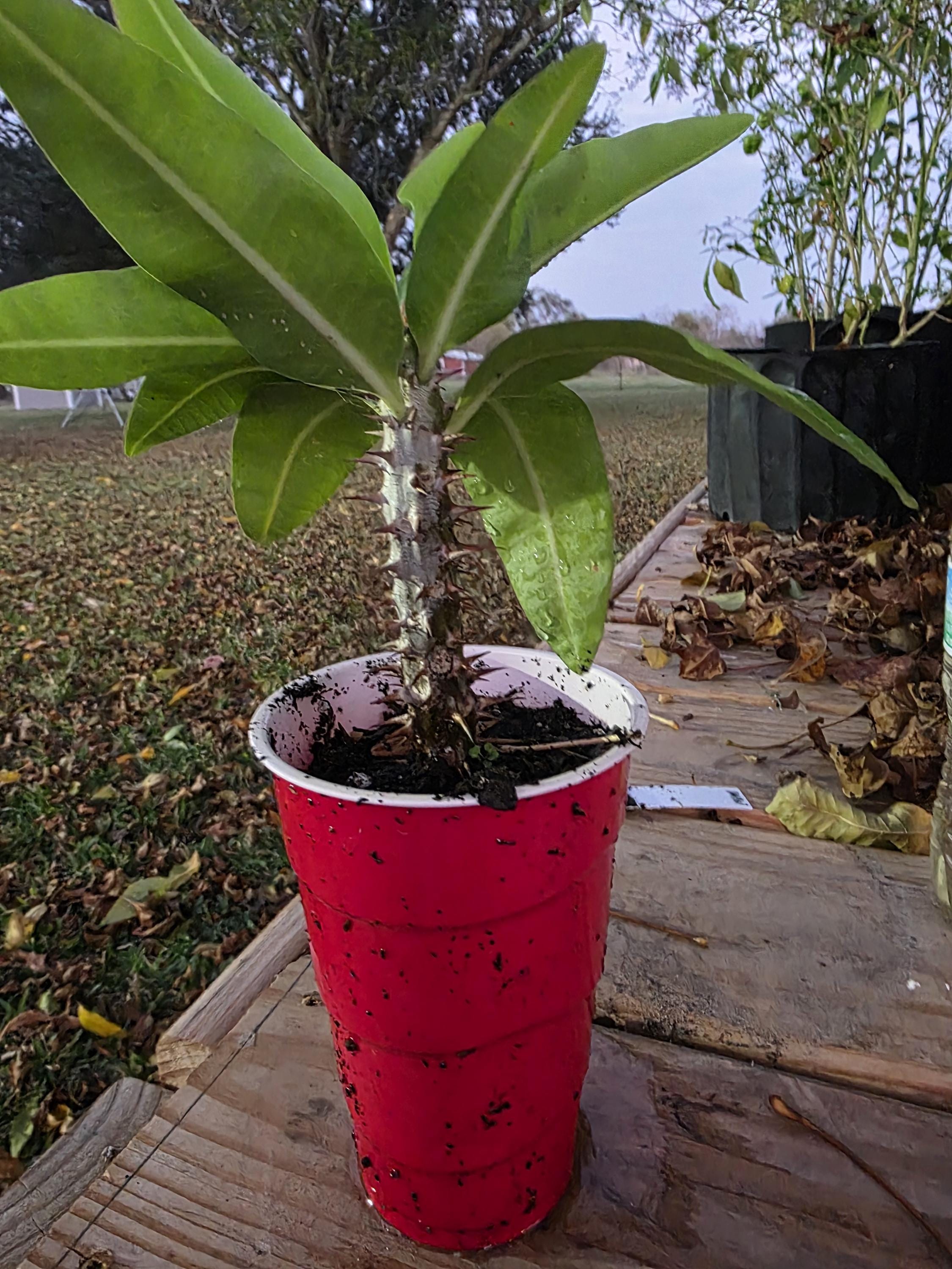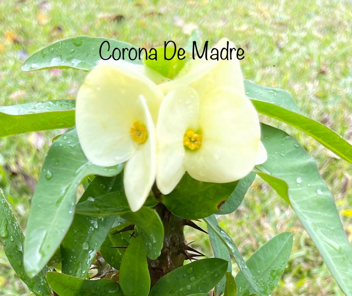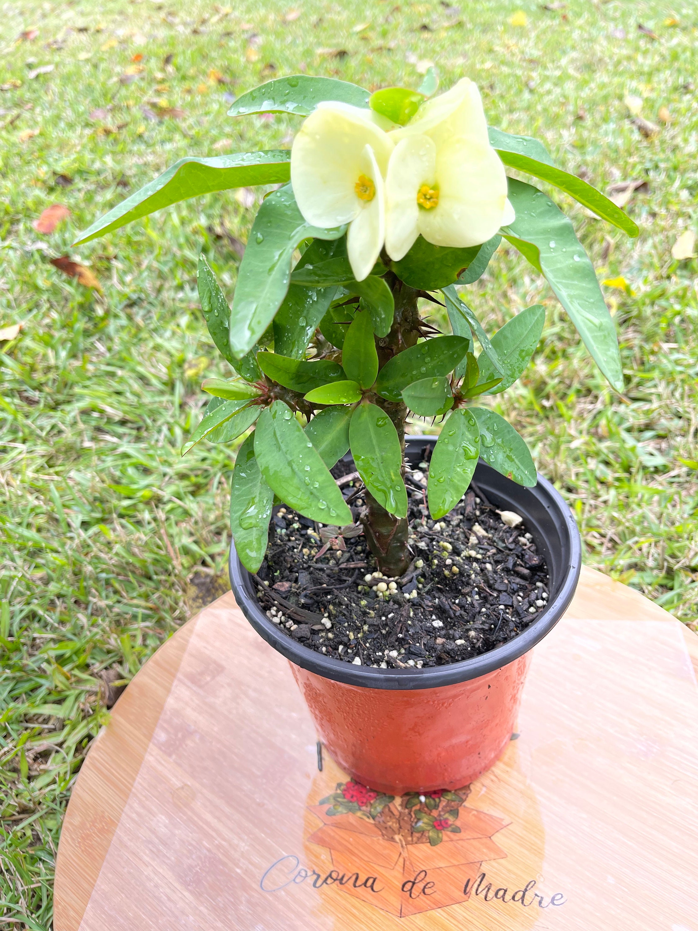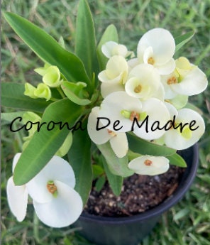 Beautiful Crown of Thorns with large blooms and savers baby thorns!!!!!. You will receive 9-13inch plant with bare roots and some soil. This plant is drought tolerant. Full sun is needed, Use a well-draining potting mix containing perlite, and/or pine bark, soil must be drained before planting and weekly watering during hot weather.