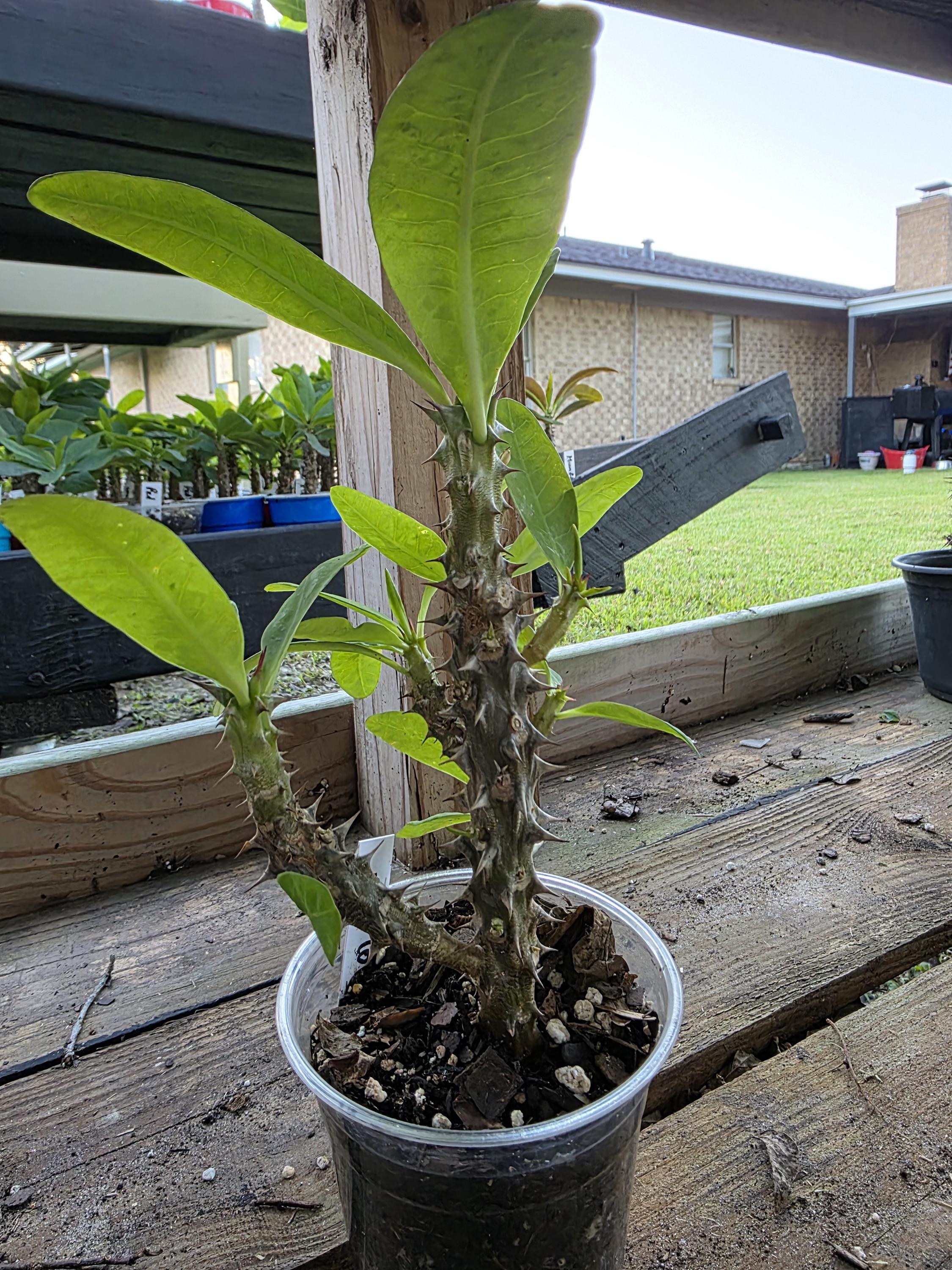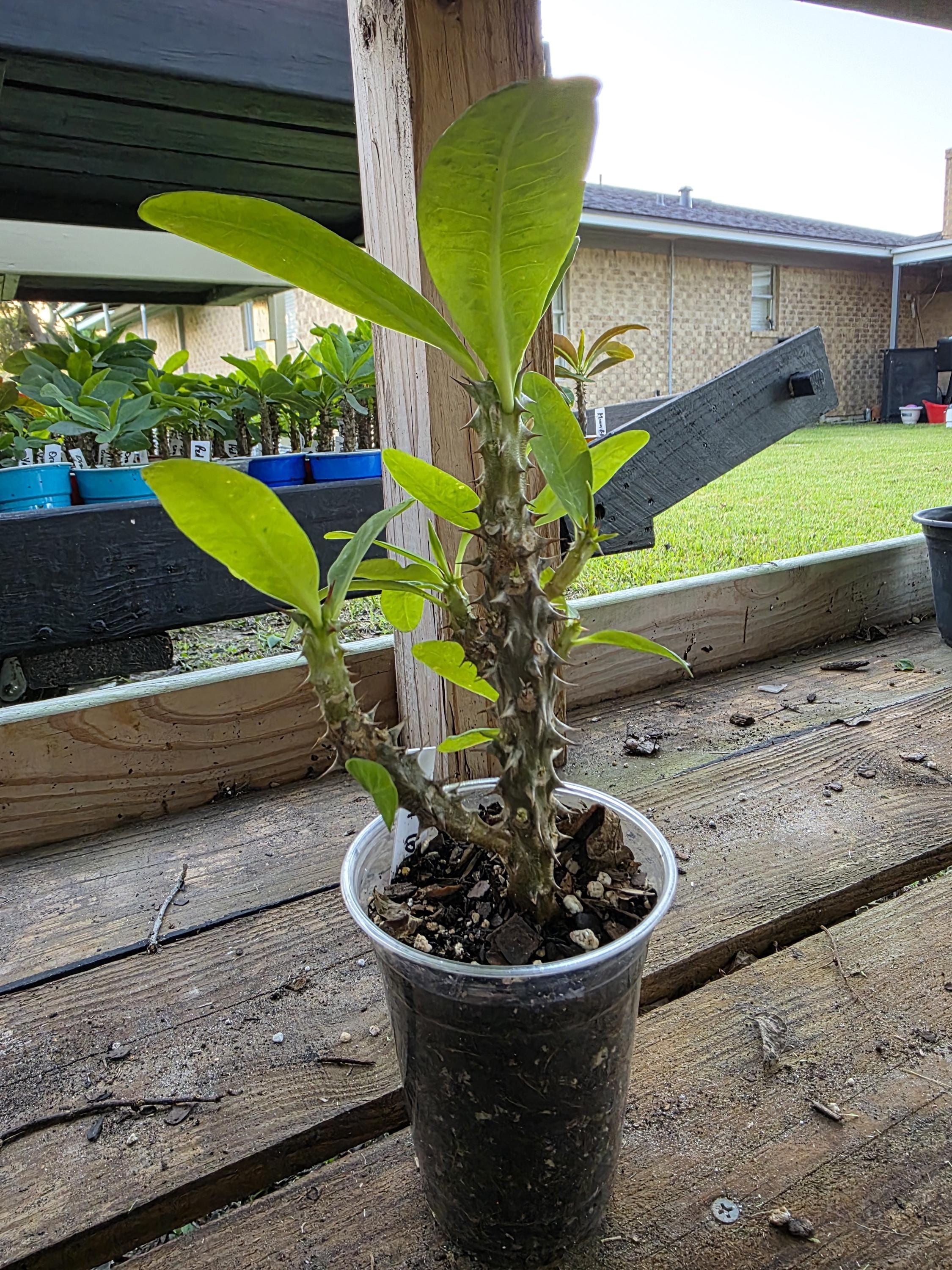 Beautiful Crown of Thorns with Large blooms. You will receive 6-10in plant with bare roots and some soil.  This plant is drought tolerant. Full sun is needed, Use a well-draining potting mix containing perlite, and/or pine bark, soil must be drained before planting and weekly watering during hot weather.