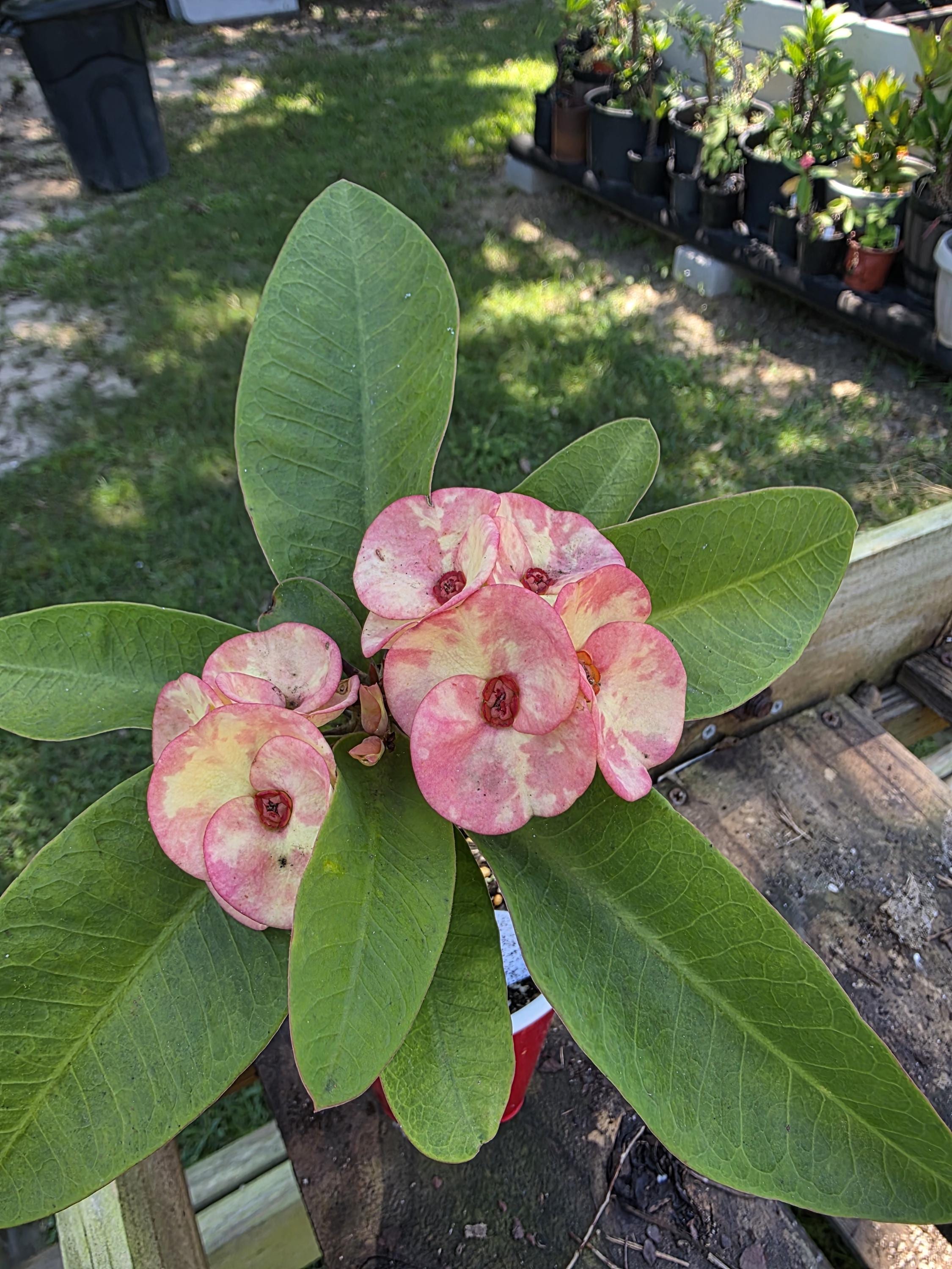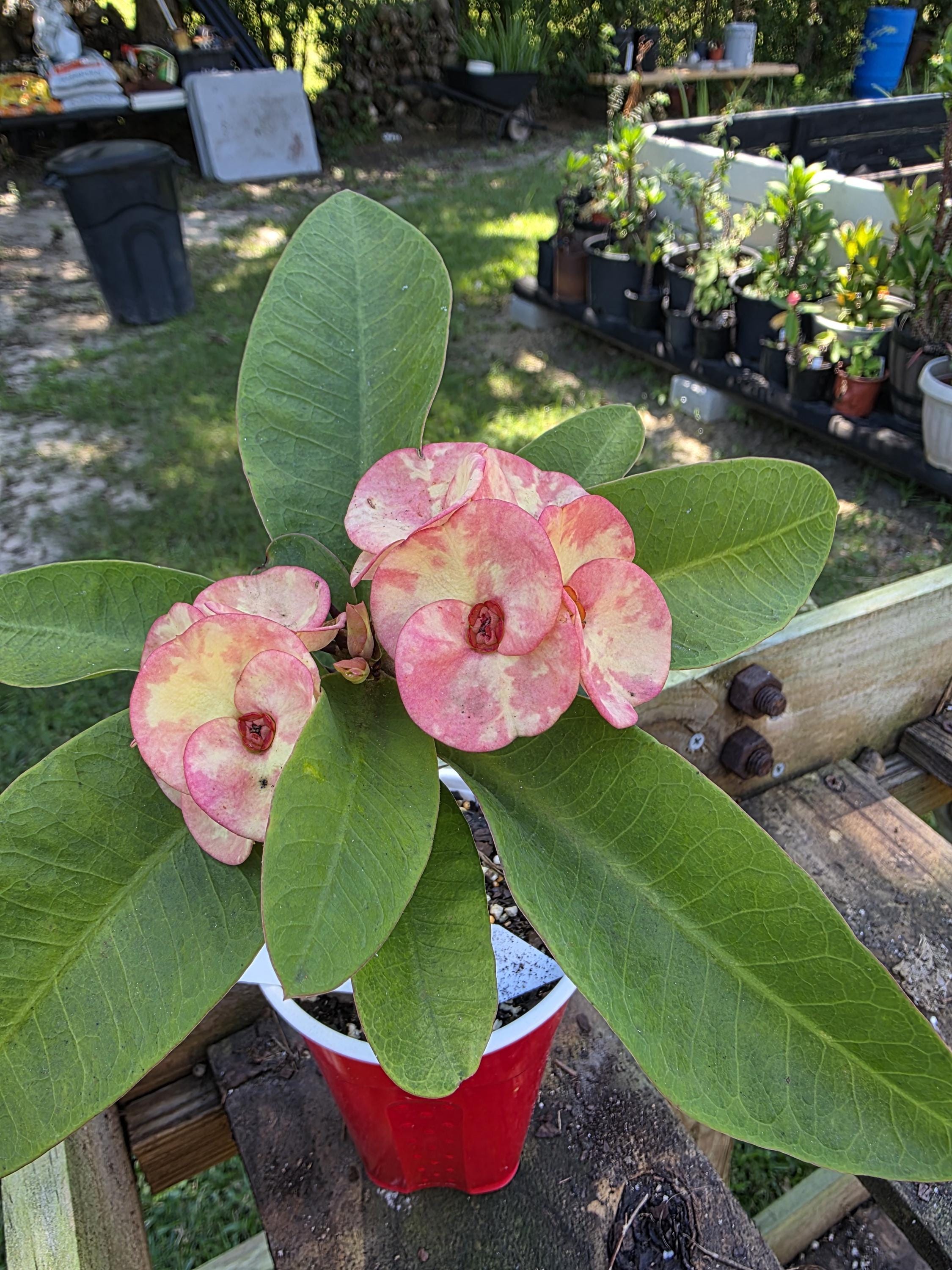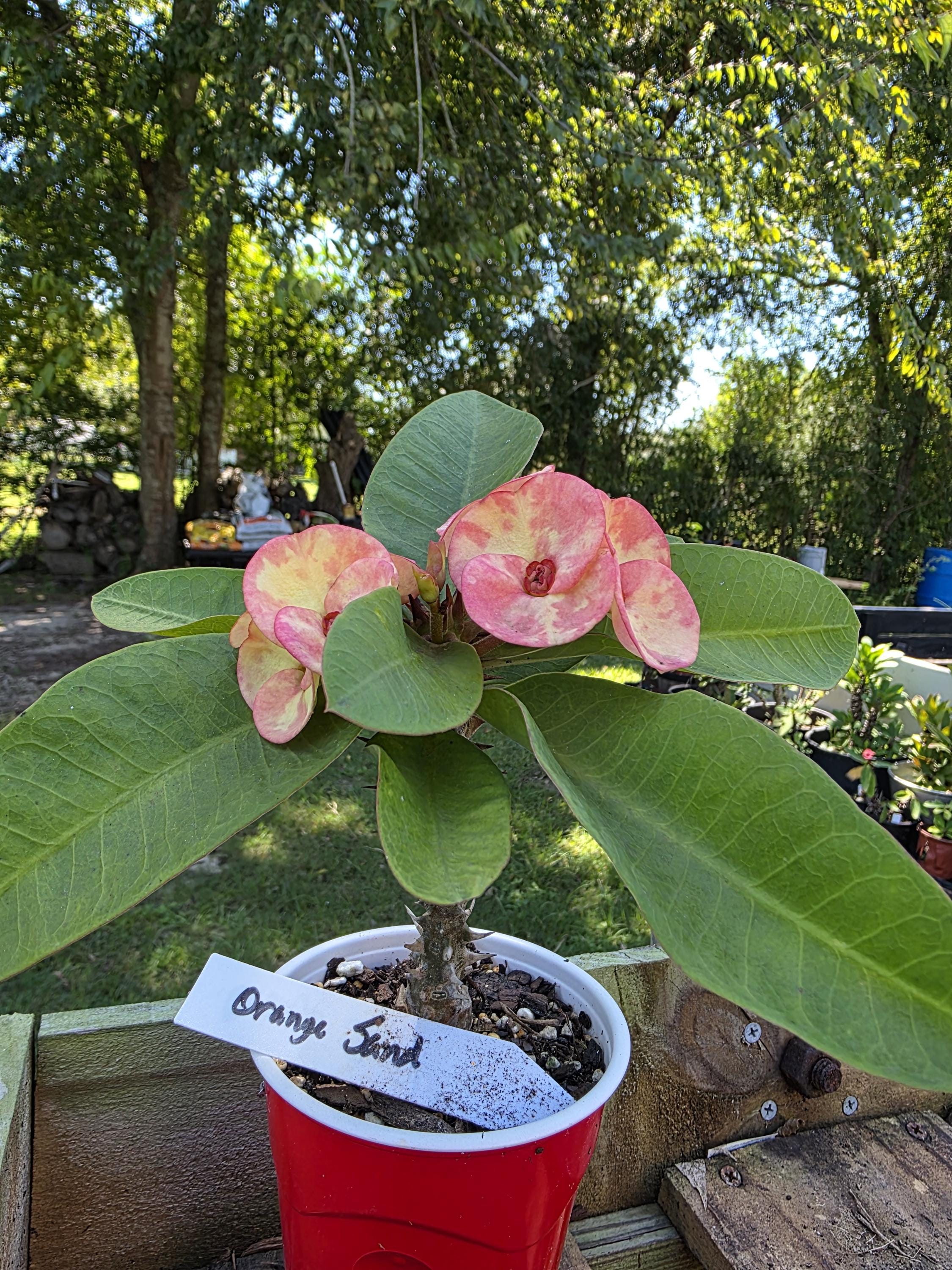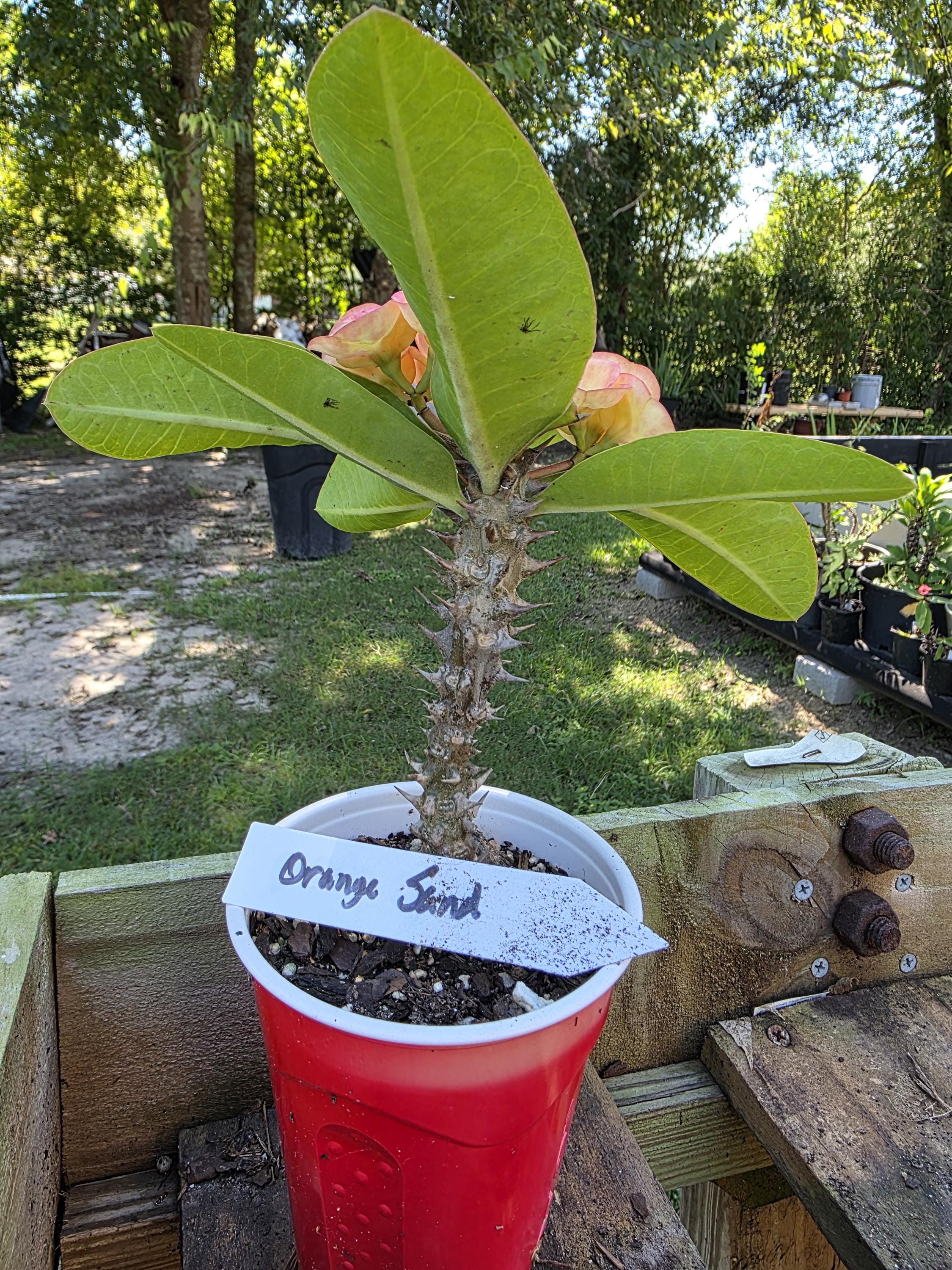 Beautiful Crown of Thorns with Large blooms. You will receive 6-10in OR LARGER plant with bare roots and some soil.  This plant is drought tolerant. Full sun is needed, Use a well-draining potting mix containing perlite, and/or pine bark, soil must be drained before planting and weekly watering during hot weather.