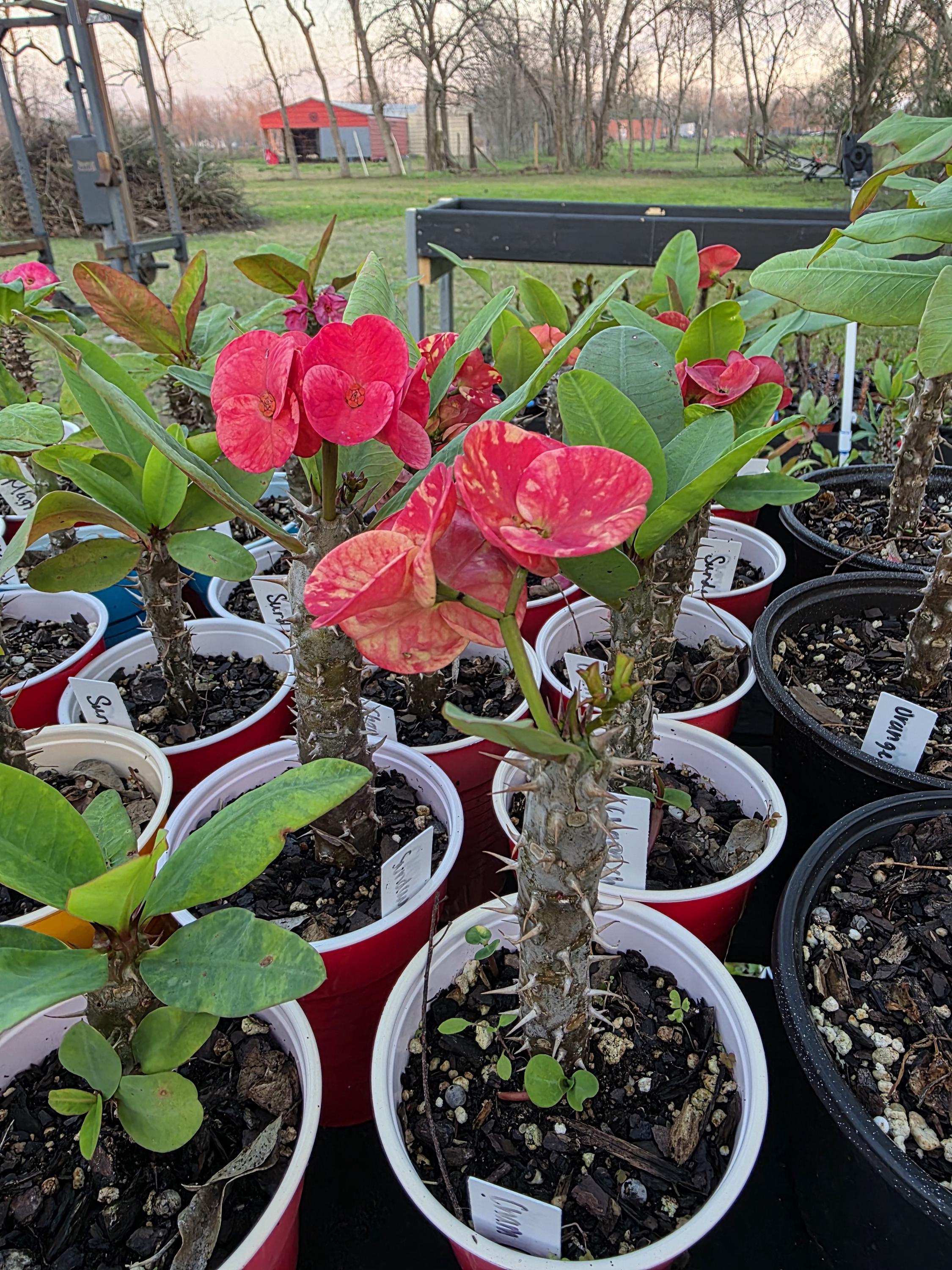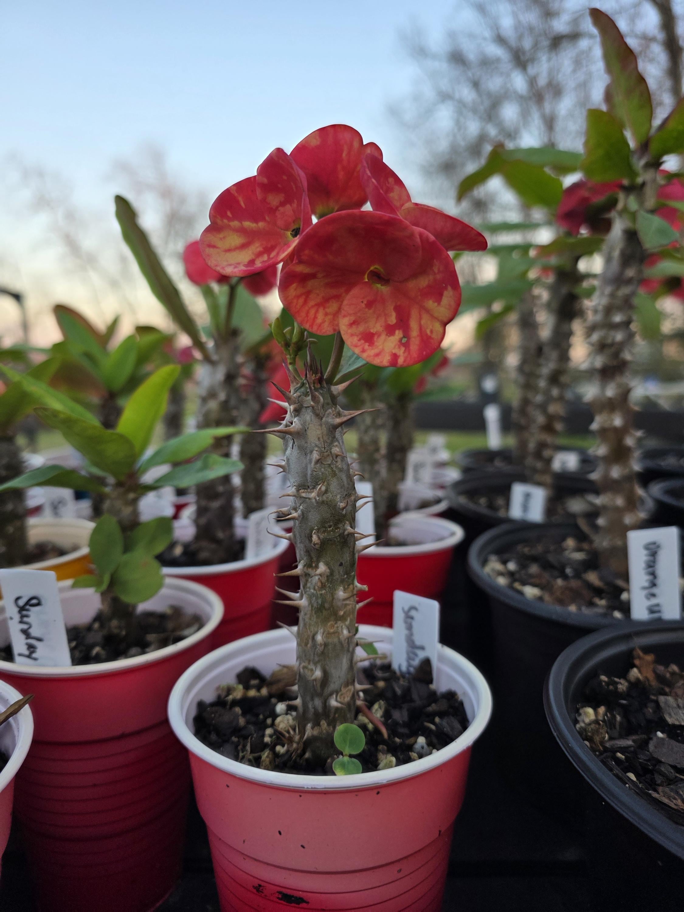 Beautiful Crown of Thorns with Large blooms. You will receive 3-6 INCH OR LARGE plant with bare roots and some soil. This plant is drought tolerant. Full sun is needed, Use a well-draining potting mix containing perlite, and/or pine bark, soil must be drained before planting and weekly watering during hot weather.
