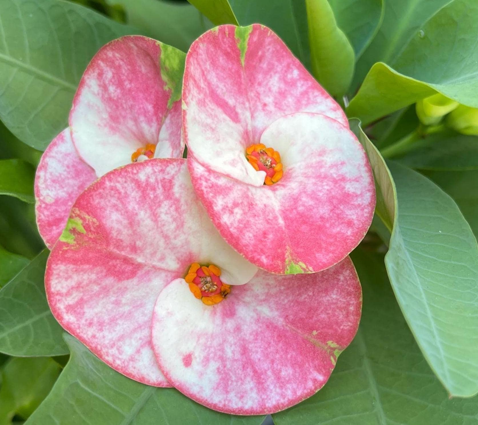 Beautiful Crown of Thorns with Large blooms. You will receive 3-6 INCH Plant OR LARGE plant with bare roots and some soil.  This plant is drought tolerant. Full sun is needed, Use a well-draining potting mix containing perlite, and/or pine bark, soil must be drained before planting and weekly watering during hot weather.
