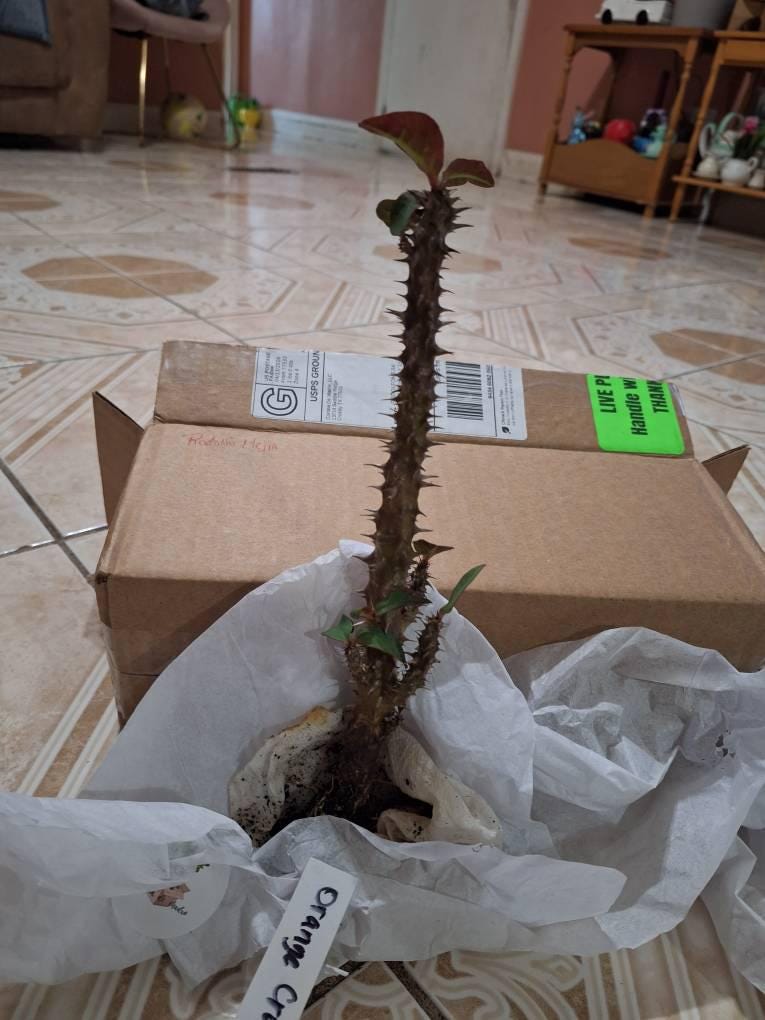 Beautiful Crown of Thorns with Large blooms. You will receive 3-6 INCH Plant OR LARGE plant with bare roots and some soil. This plant is drought tolerant. Full sun is needed, Use a well-draining potting mix containing perlite, and/or pine bark, soil must be drained before planting and weekly watering during hot weather.