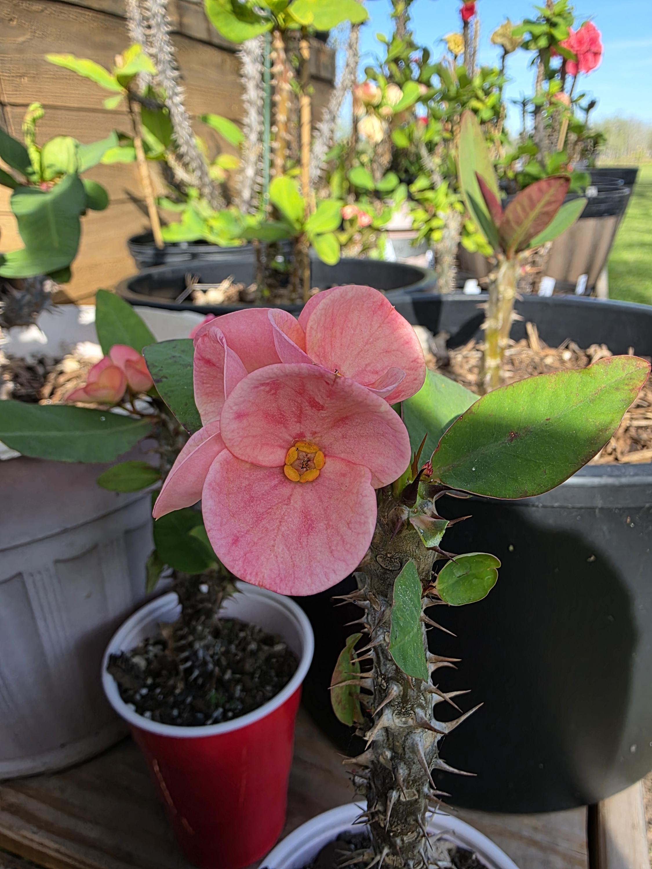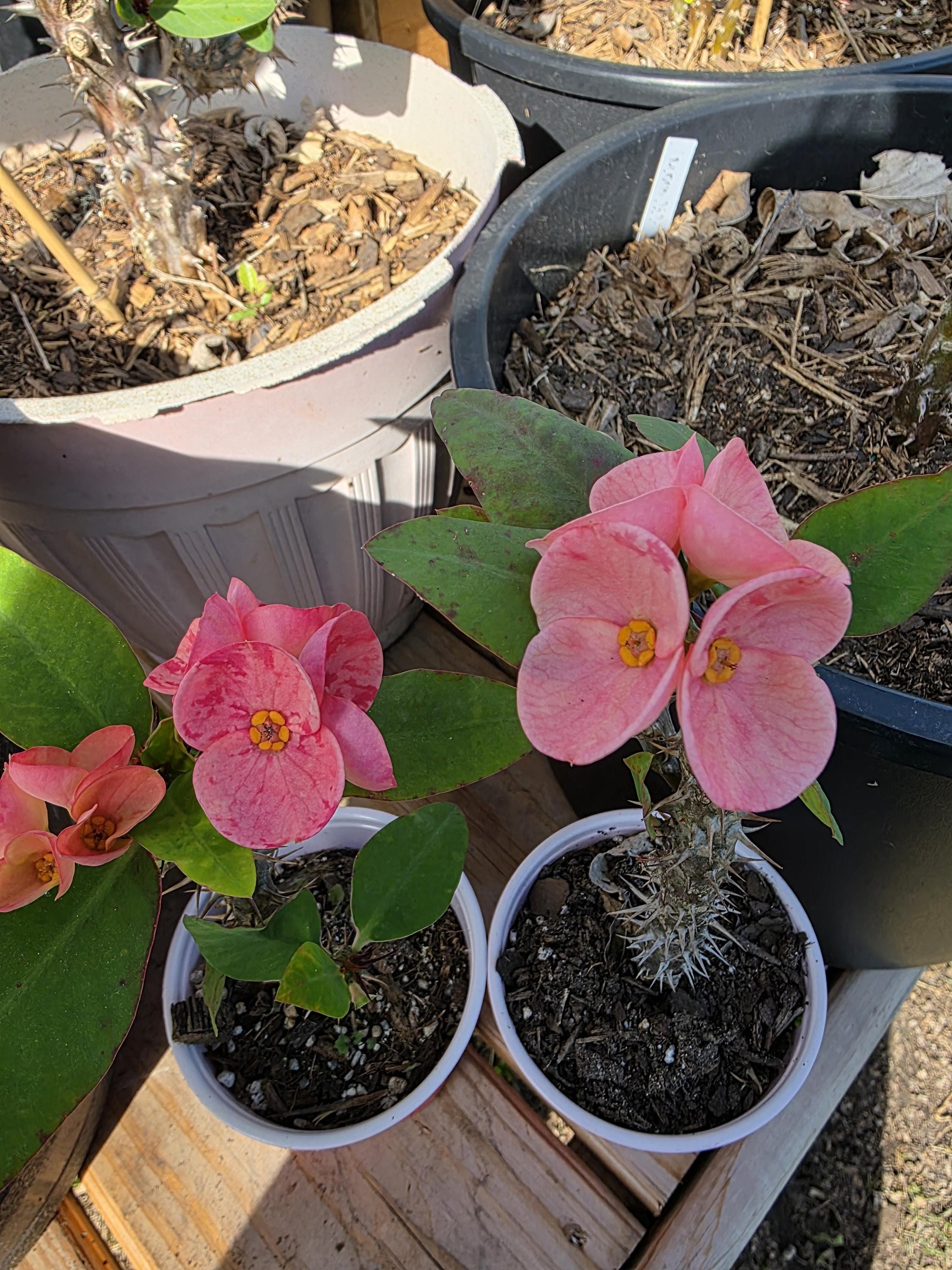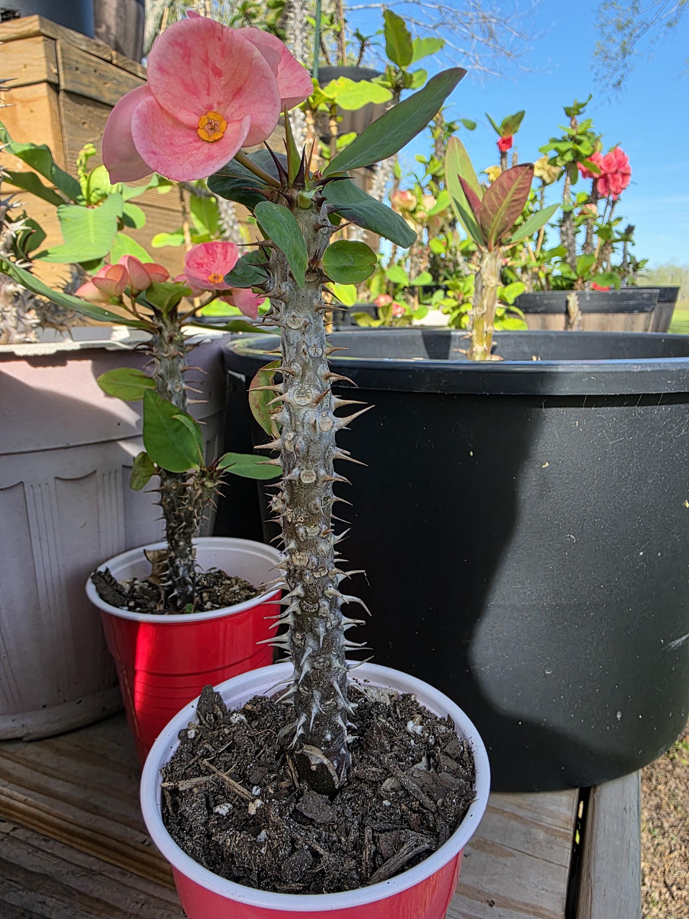 Beautiful Crown of Thorns with Large blooms. You will receive 3-6in OR LARGE plant with bare roots and some soil. This plant is drought tolerant. Full sun is needed, Use a well-draining potting mix containing perlite, and/or pine bark, soil must be drained before planting and weekly watering during hot weather.