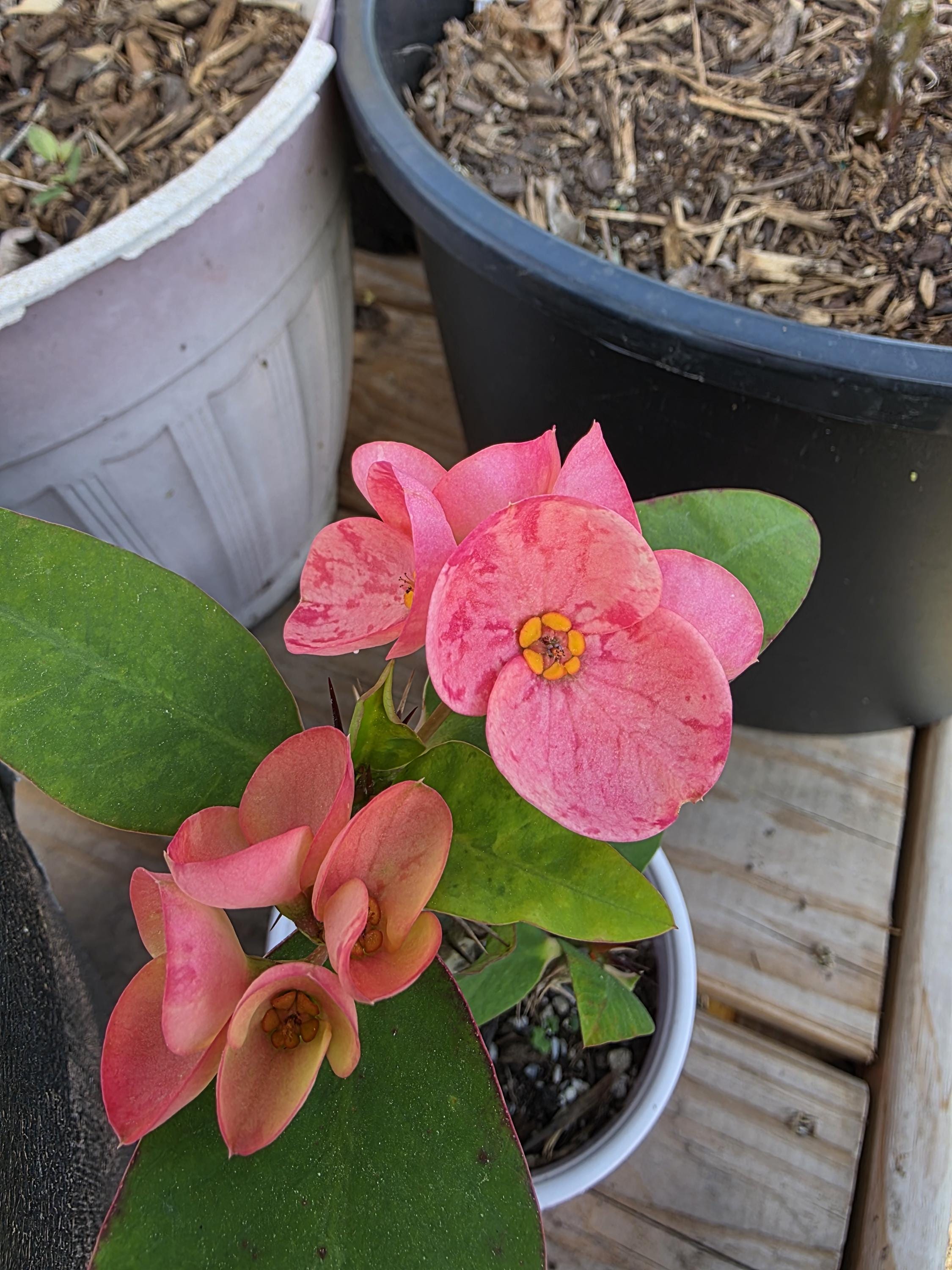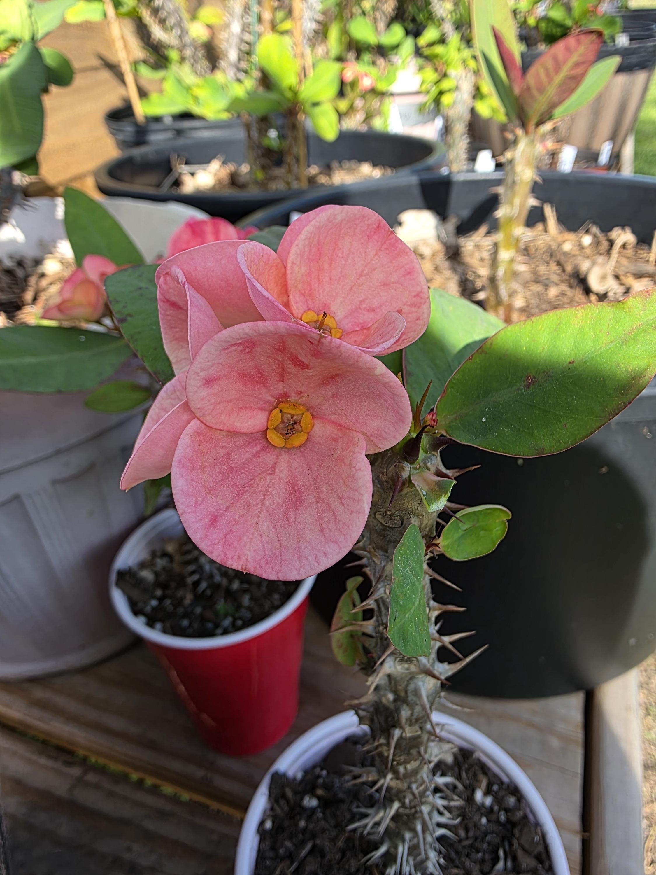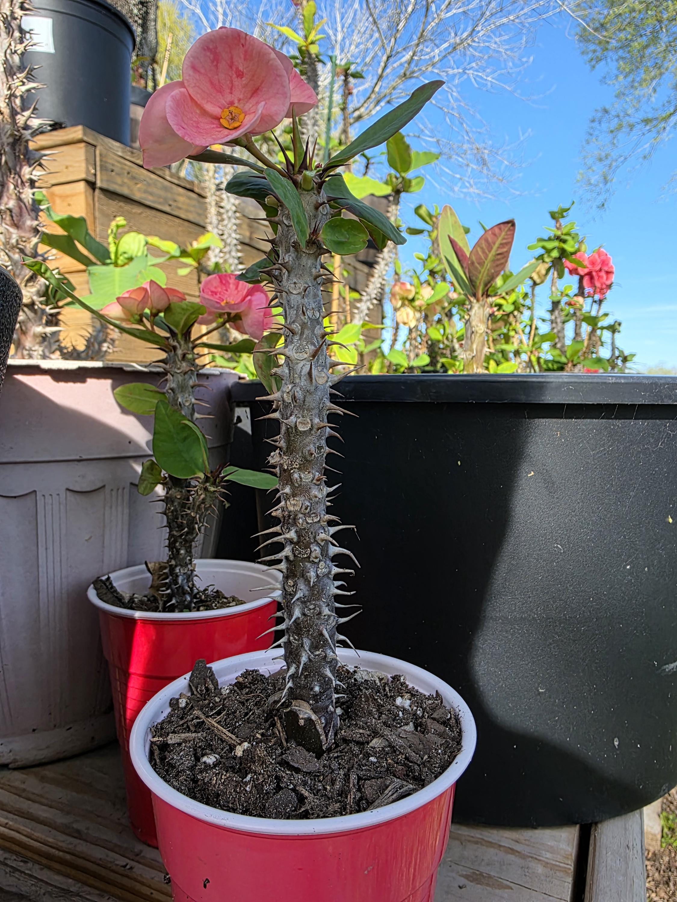 Beautiful Crown of Thorns with Large blooms. You will receive 3-6in OR LARGE plant with bare roots and some soil. This plant is drought tolerant. Full sun is needed, Use a well-draining potting mix containing perlite, and/or pine bark, soil must be drained before planting and weekly watering during hot weather.