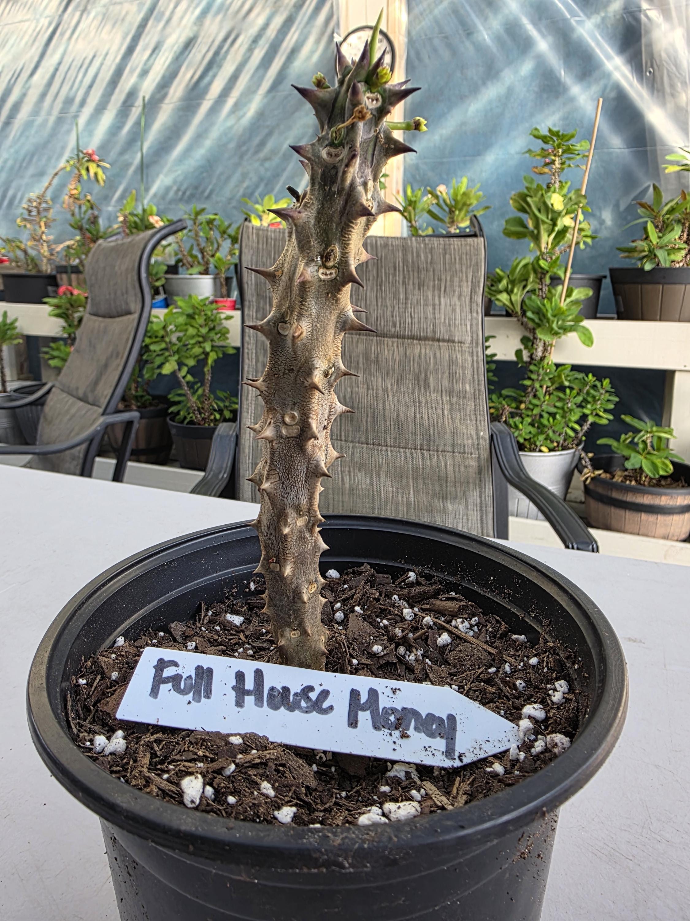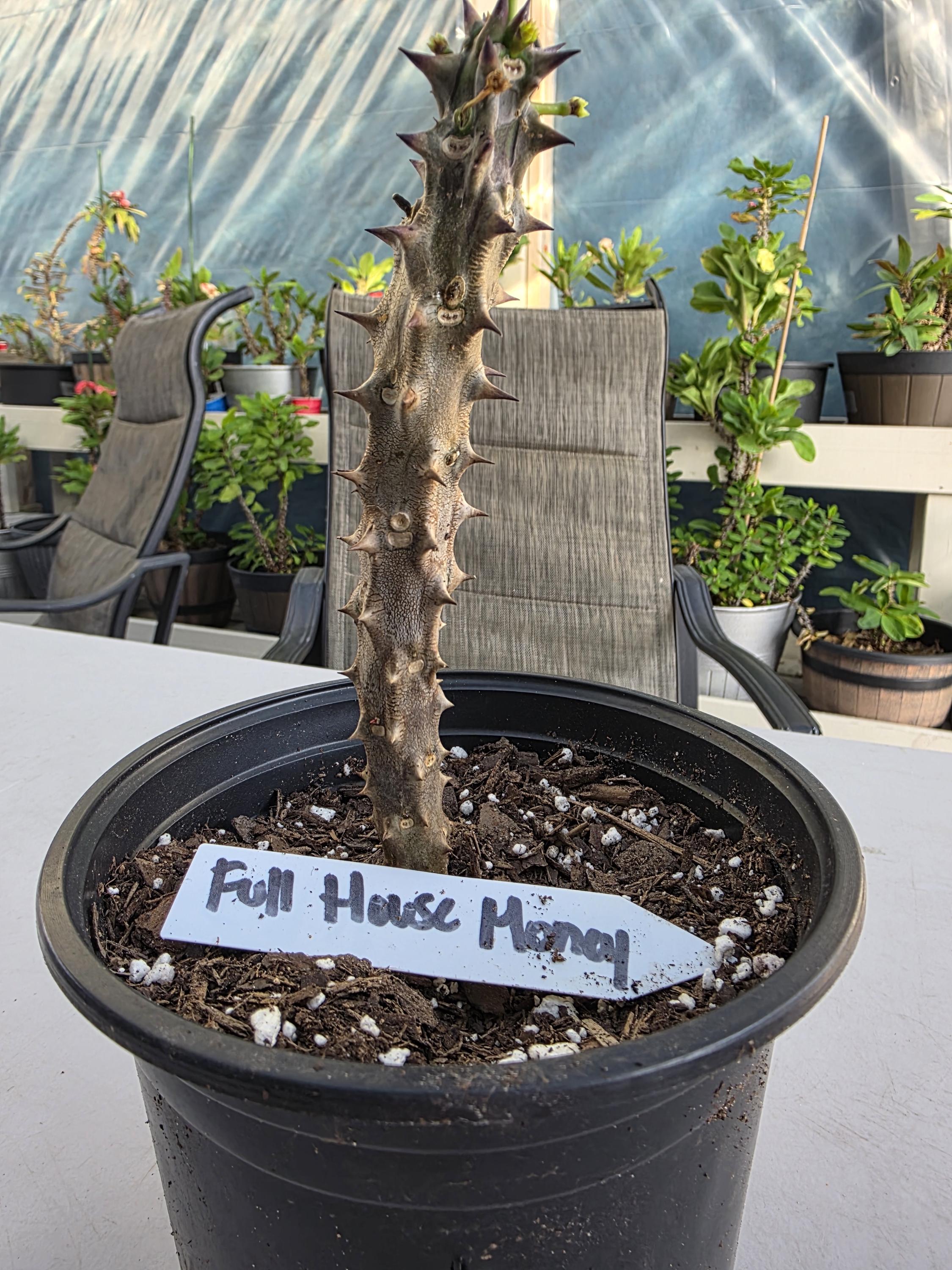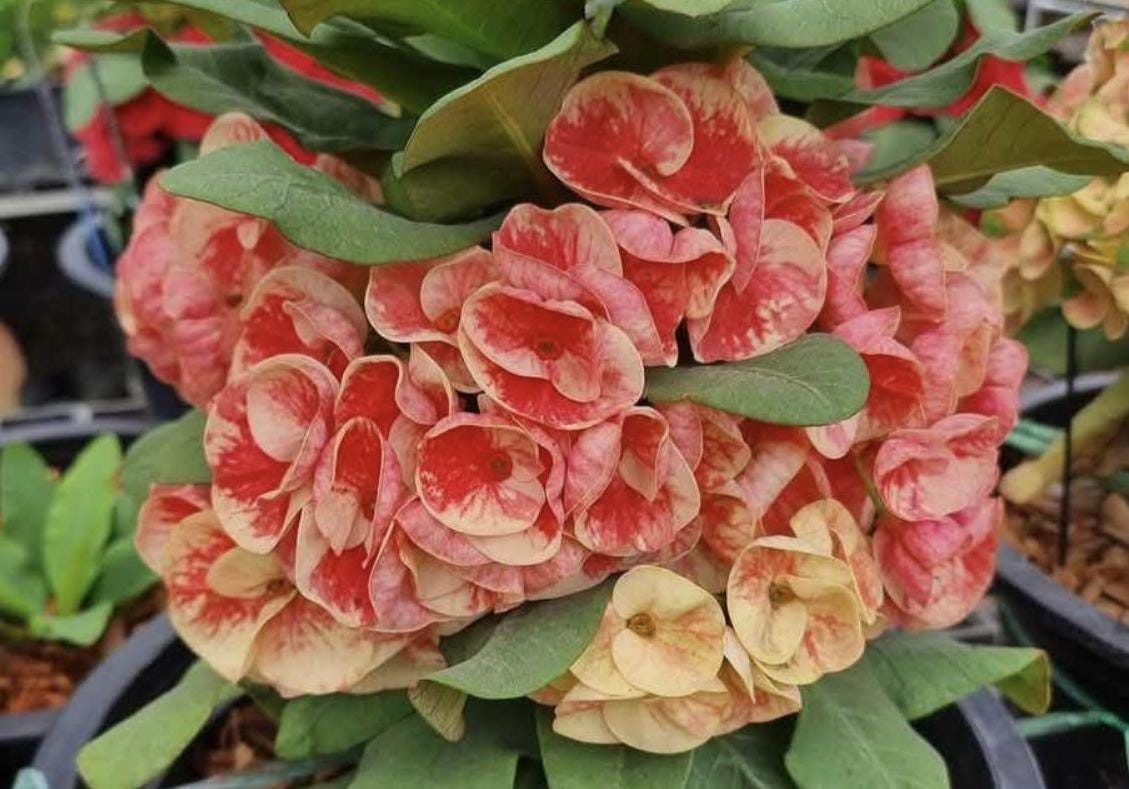 Beautiful Crown of Thorns with Medium to Large blooms. You will receive 5-10in plant with bare roots and some soil. This plant is drought tolerant. Full sun is needed, Use a well-draining potting mix containing perlite, and/or pine bark, soil must be drained before planting and weekly watering during hot weather.