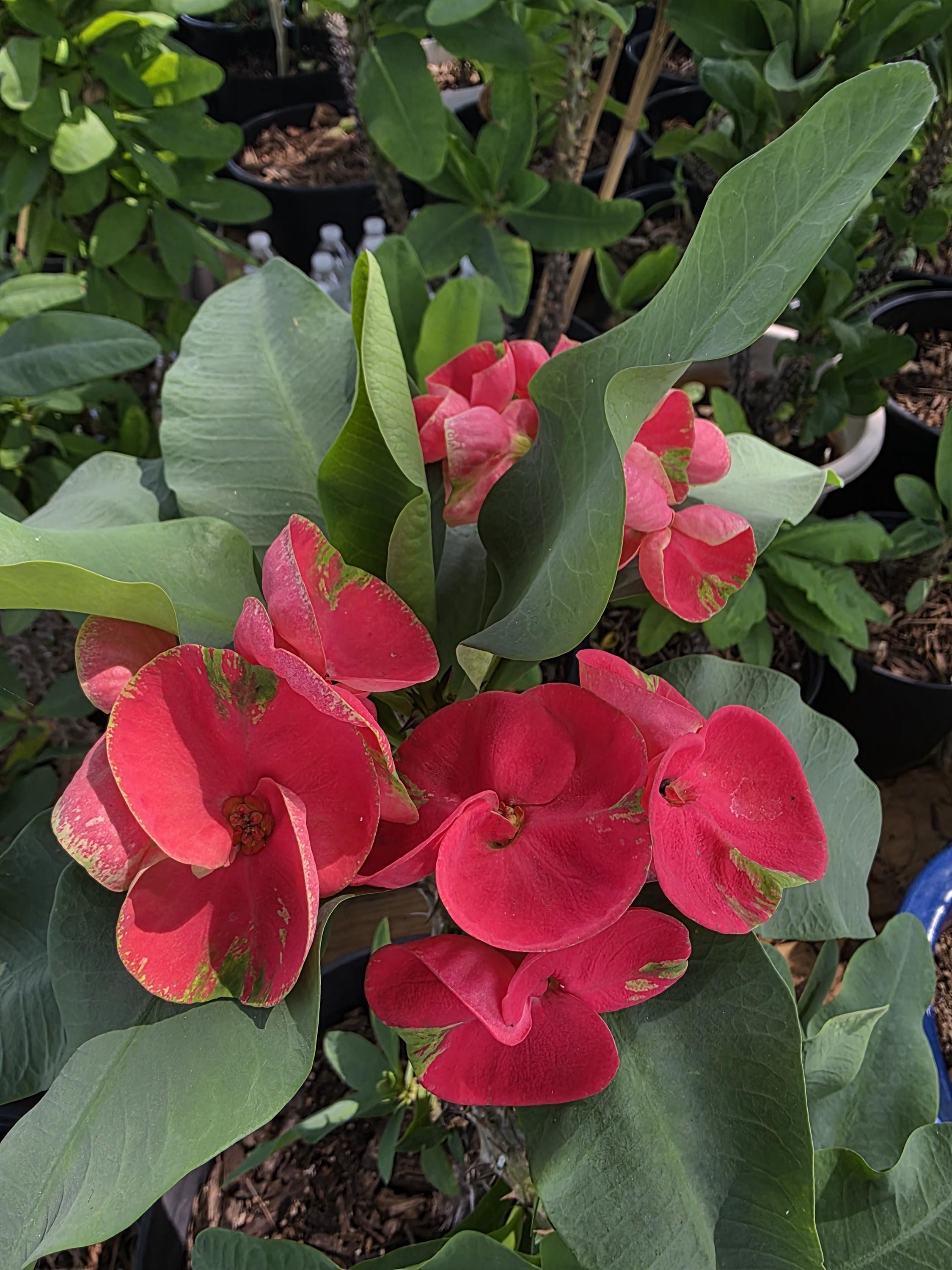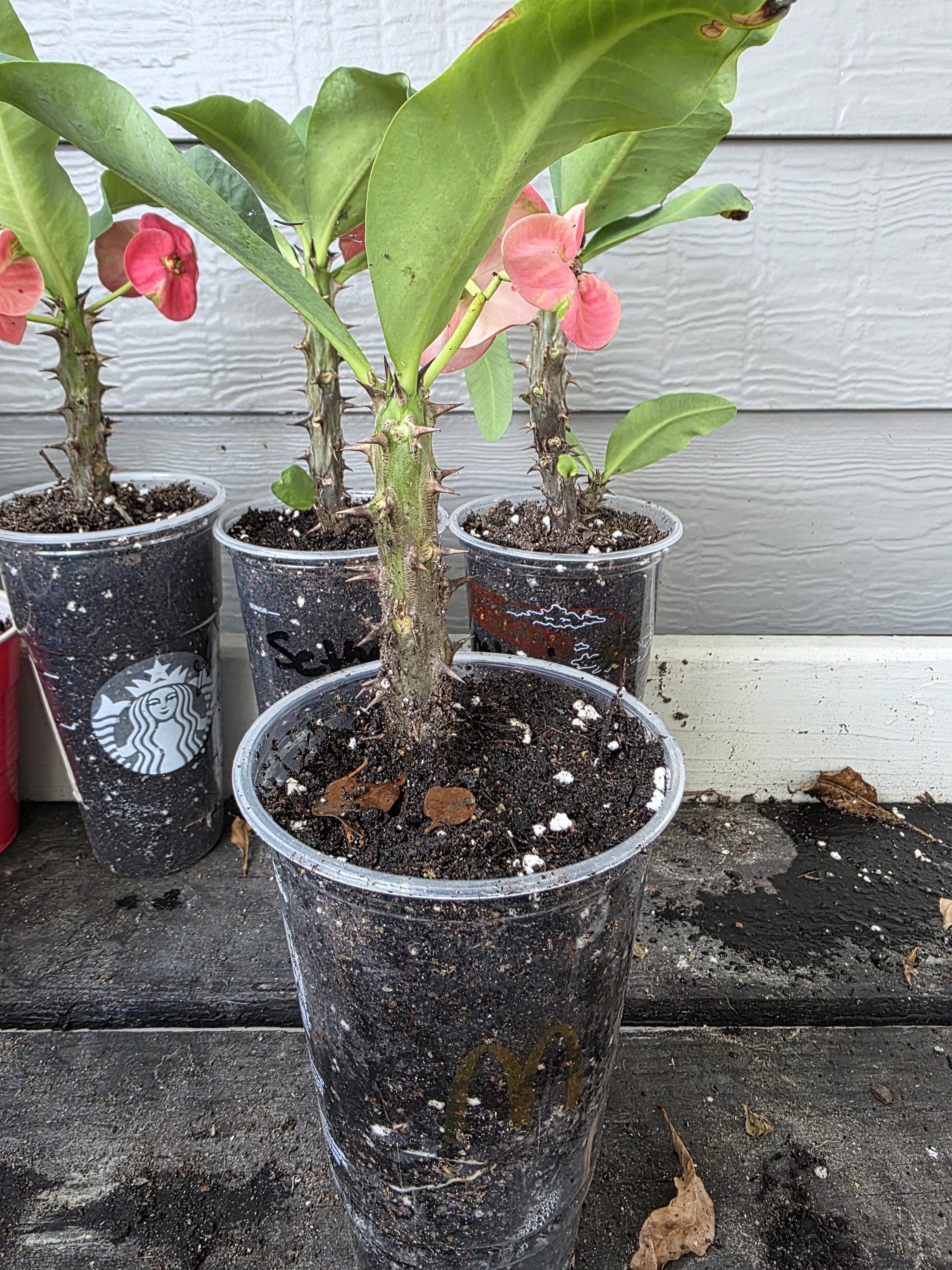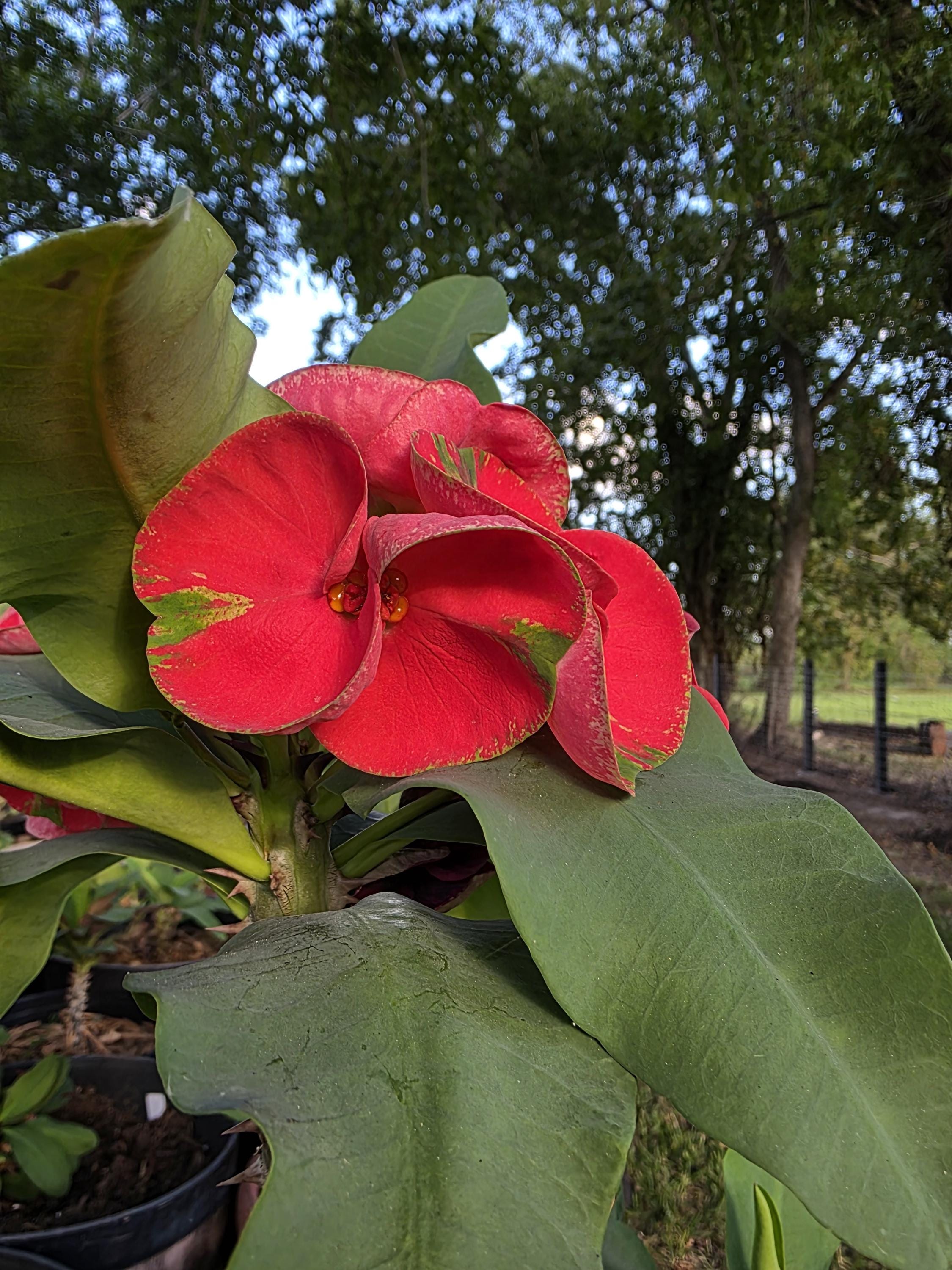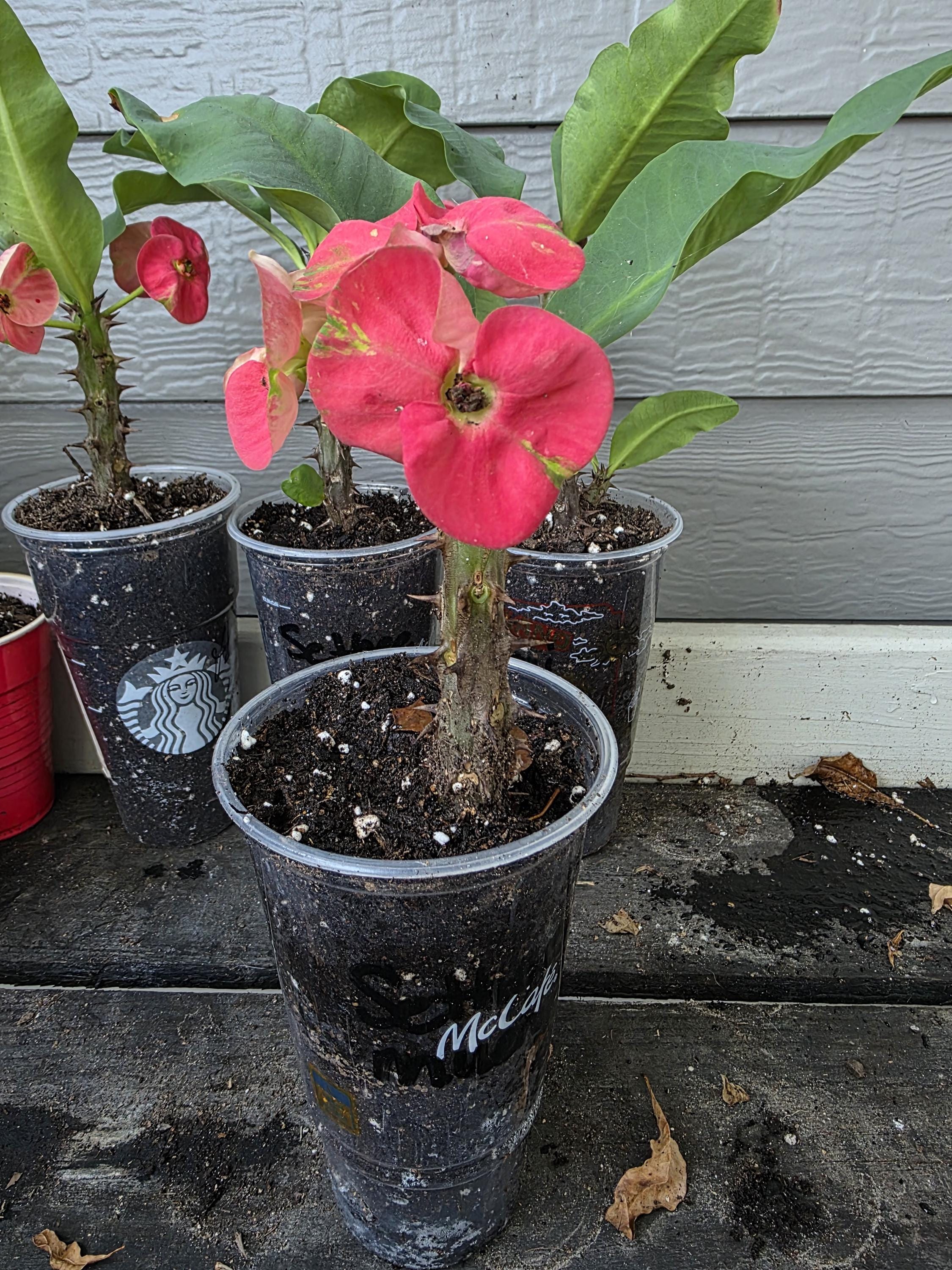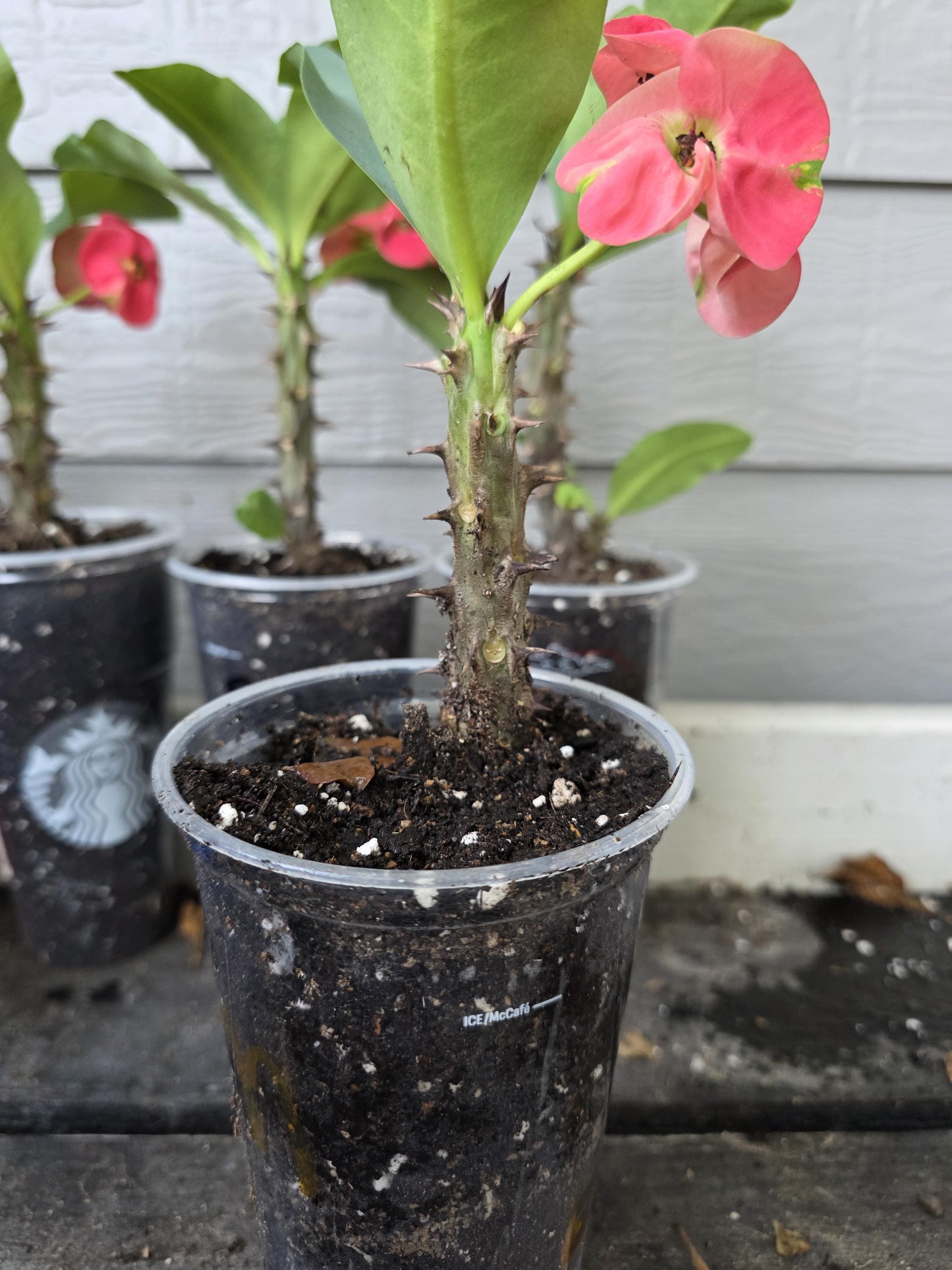 Beautiful Crown of Thorns with Large blooms. You will receive 6-10in plant with bare roots and some soil.  This plant is drought tolerant. Full sun is needed, Use a well-draining potting mix containing perlite, and/or pine bark, soil must be drained before planting and weekly watering during hot weather.