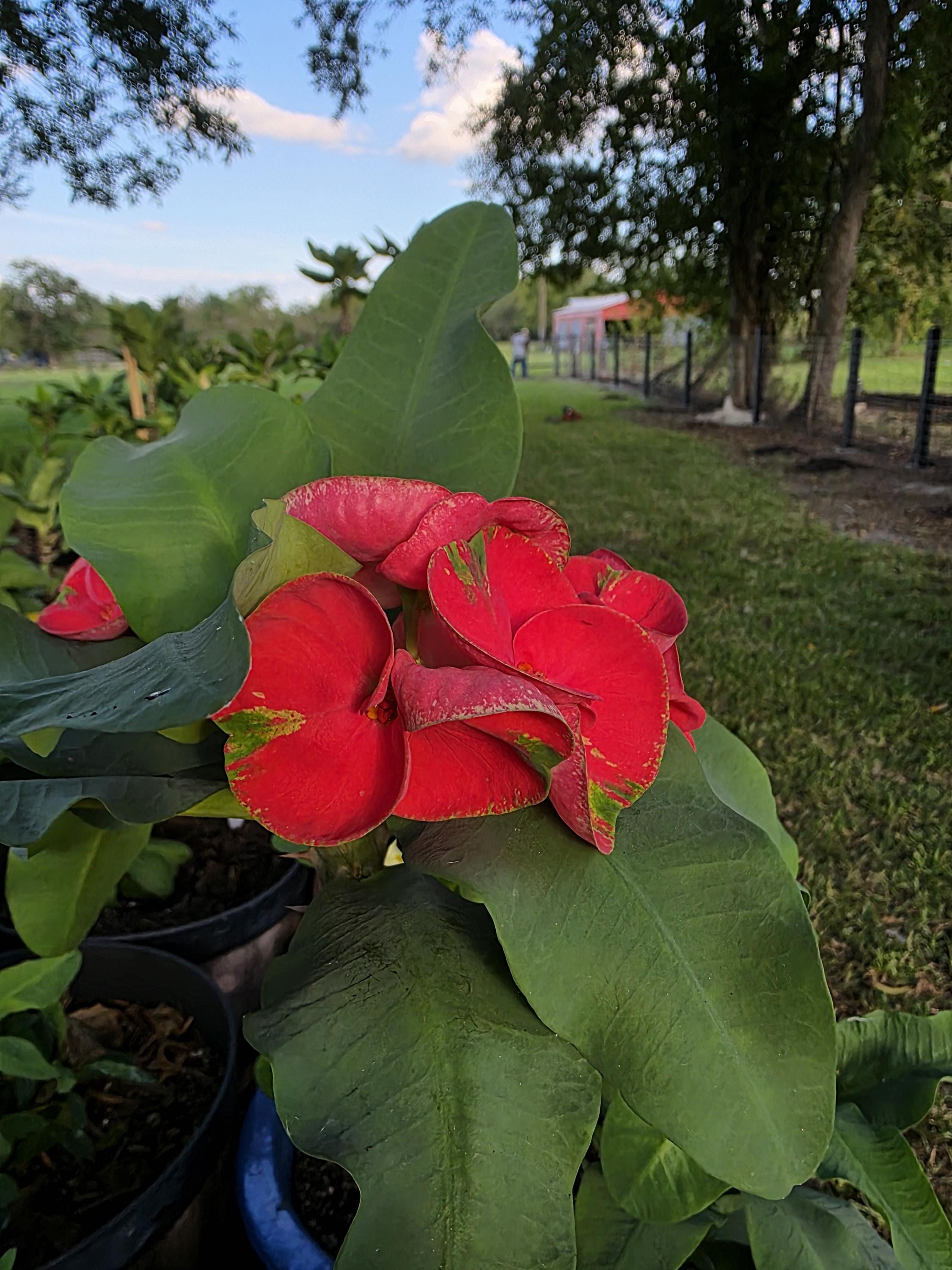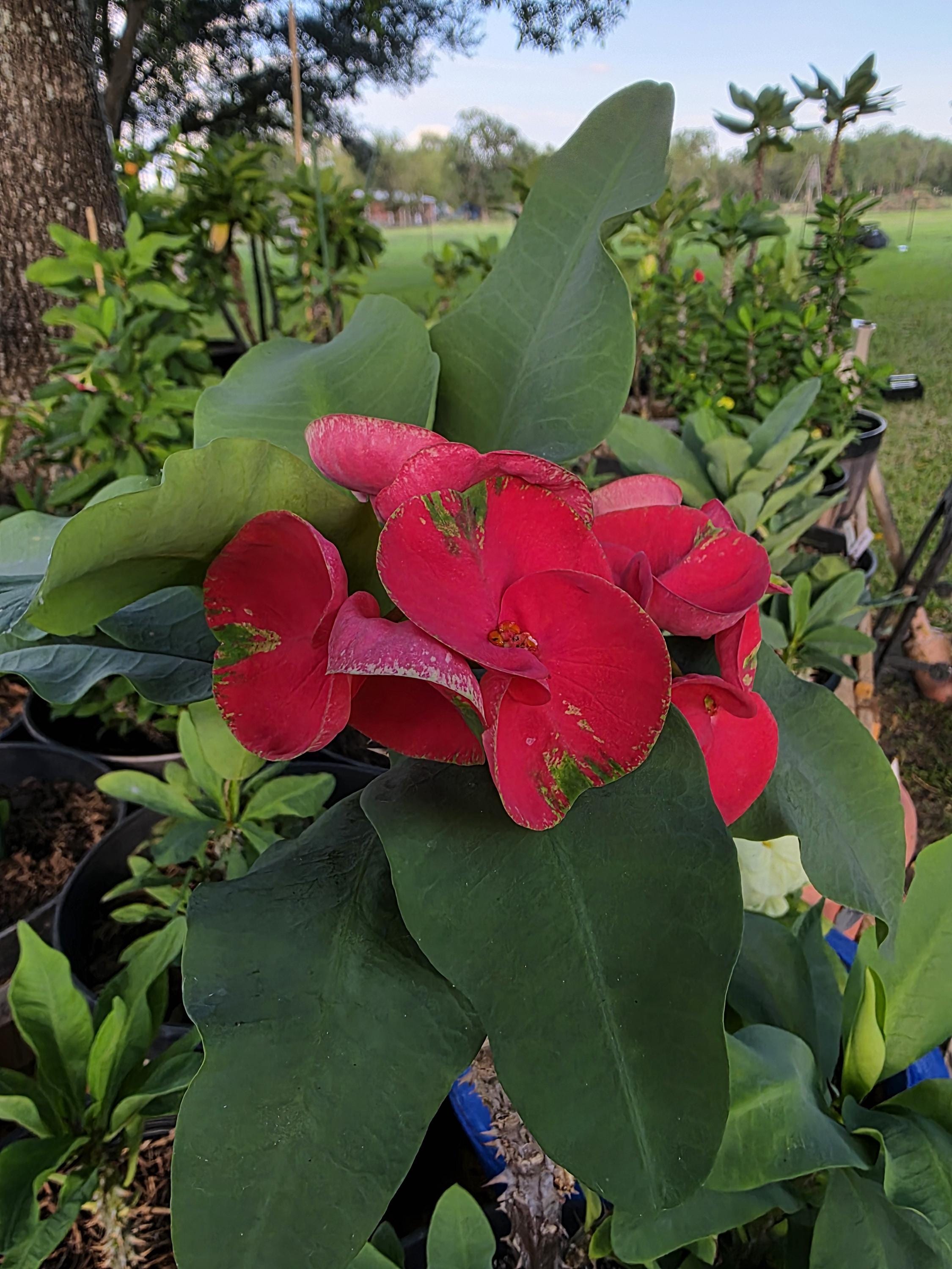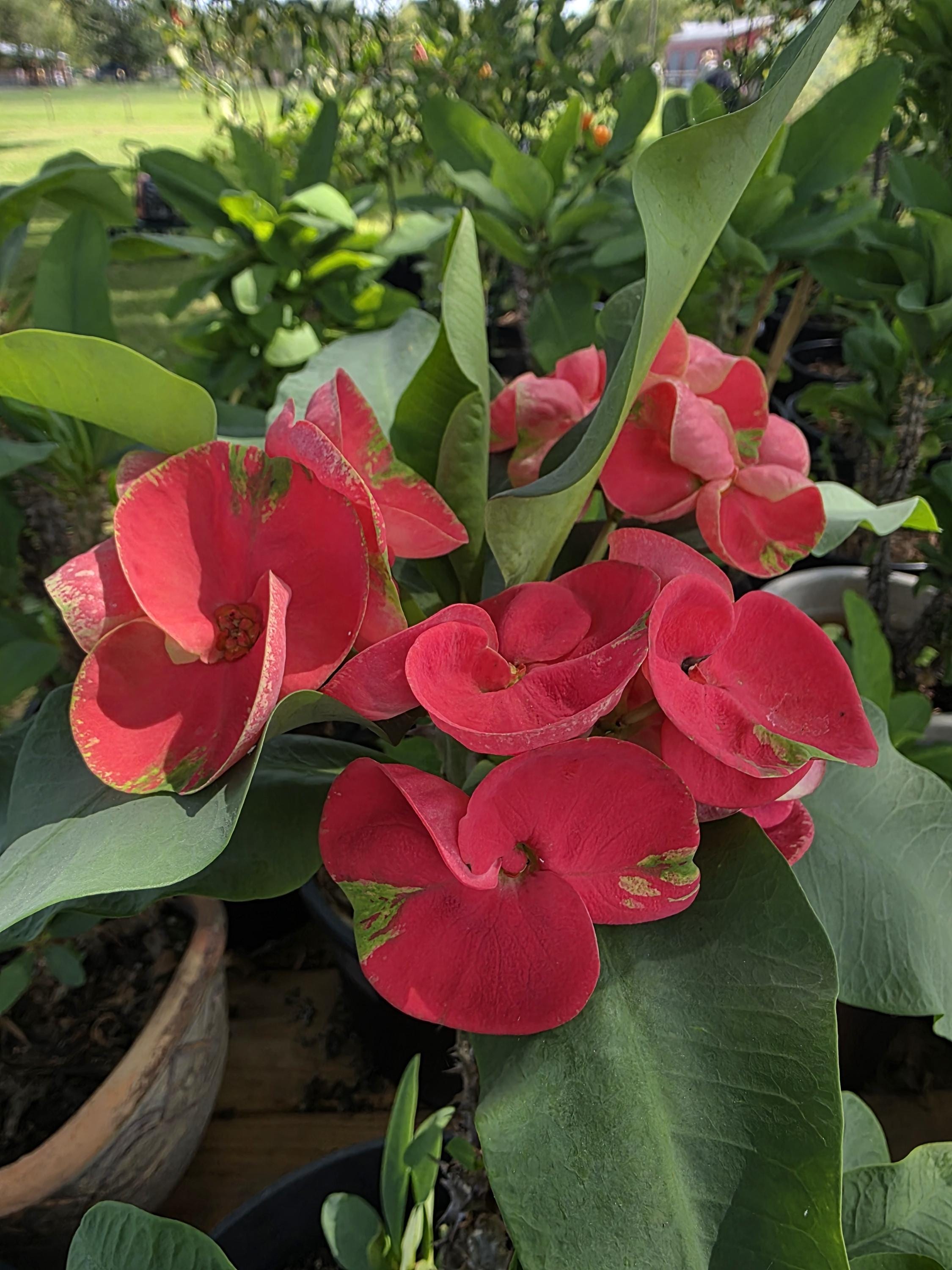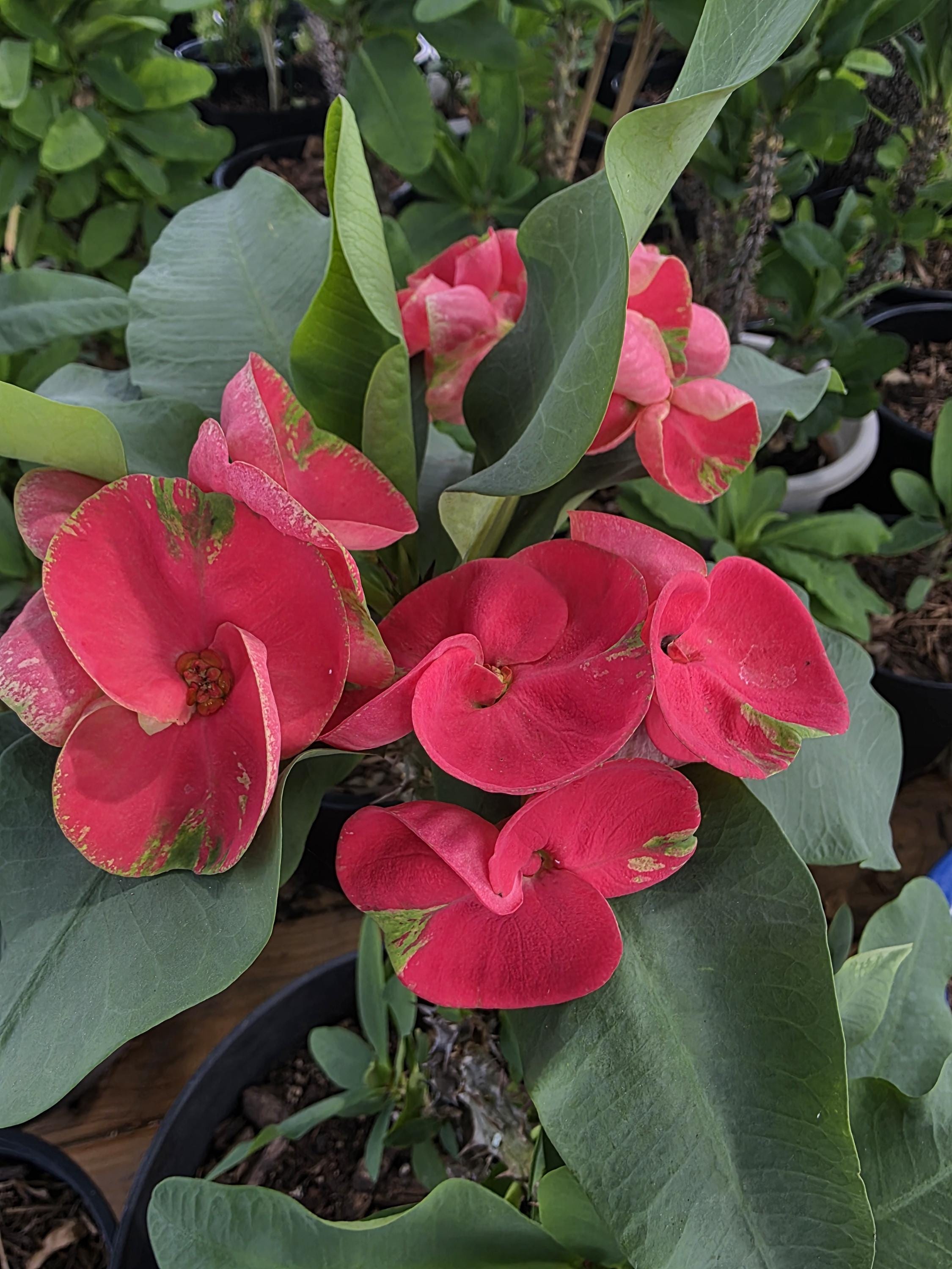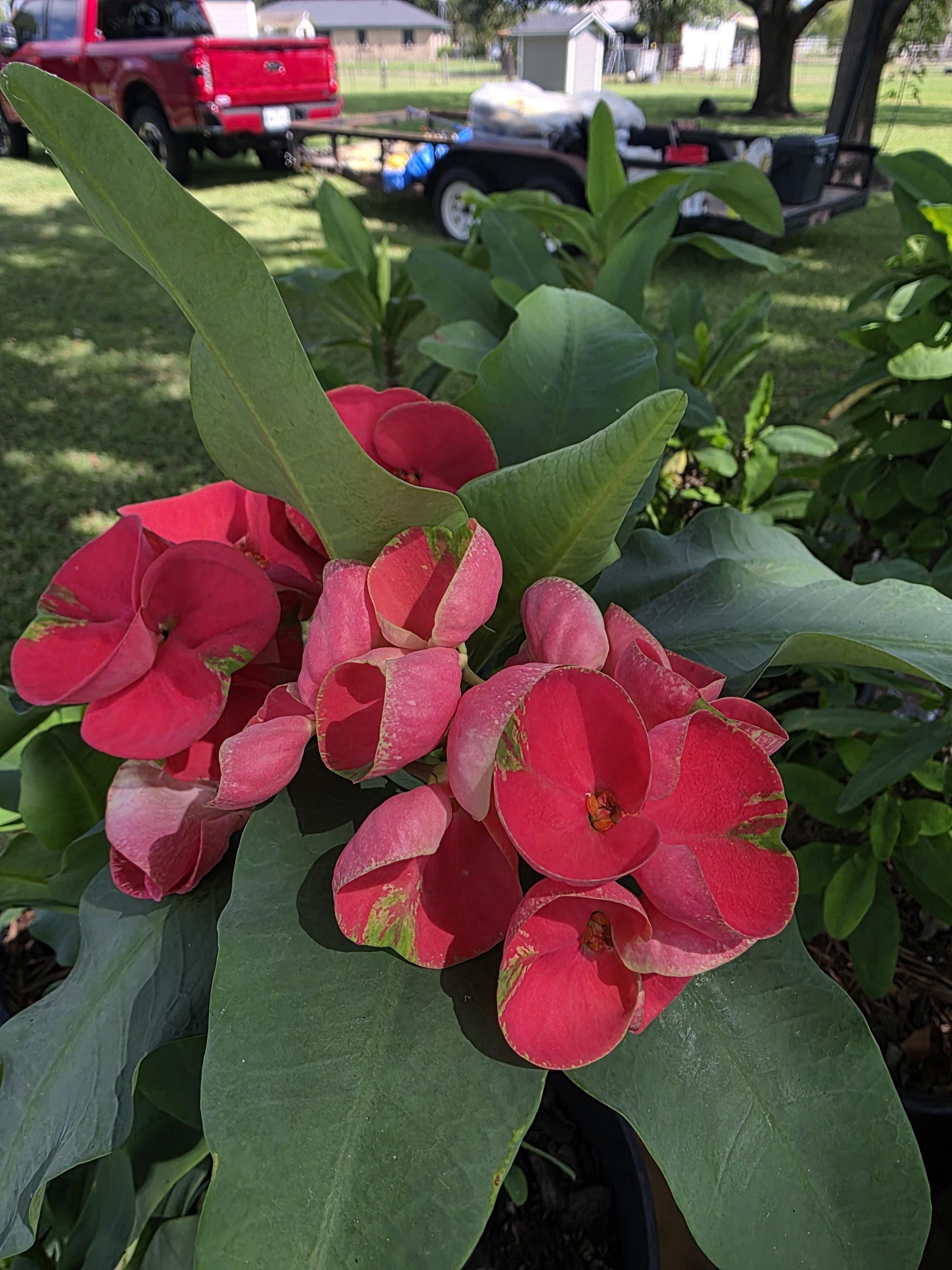 Beautiful Crown of Thorns with Large blooms. You will receive 6-10in plant with bare roots and some soil.  This plant is drought tolerant. Full sun is needed, Use a well-draining potting mix containing perlite, and/or pine bark, soil must be drained before planting and weekly watering during hot weather.
