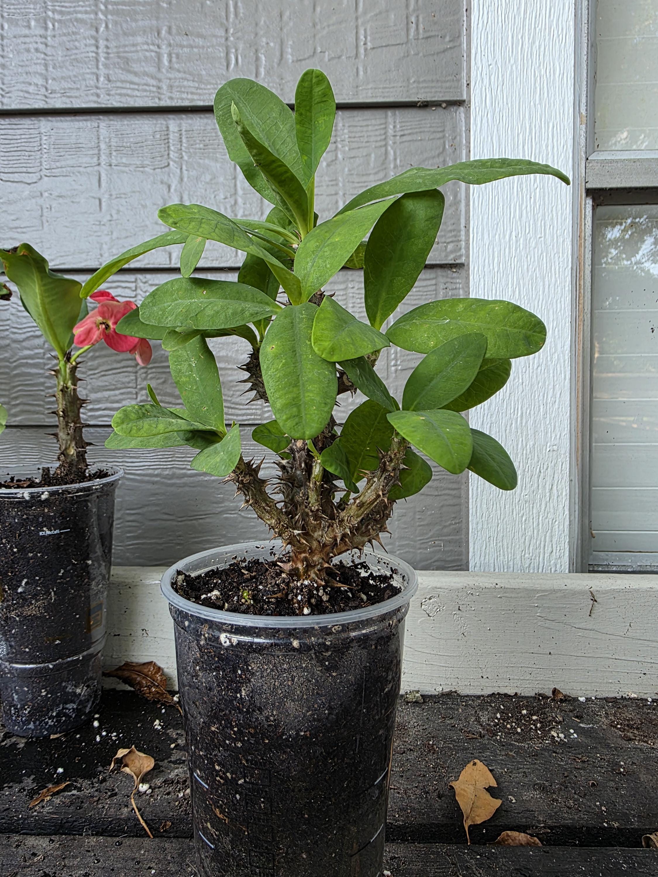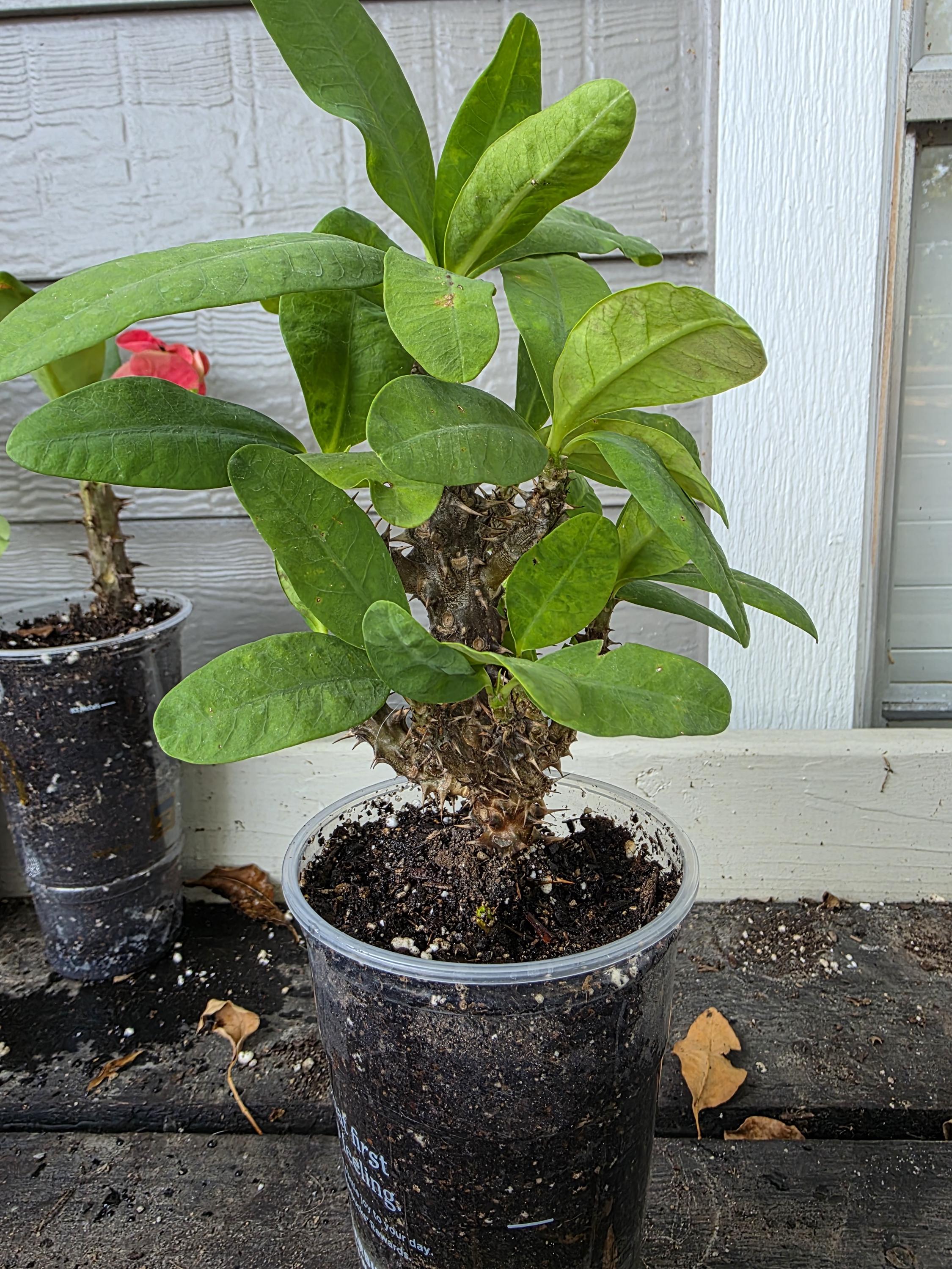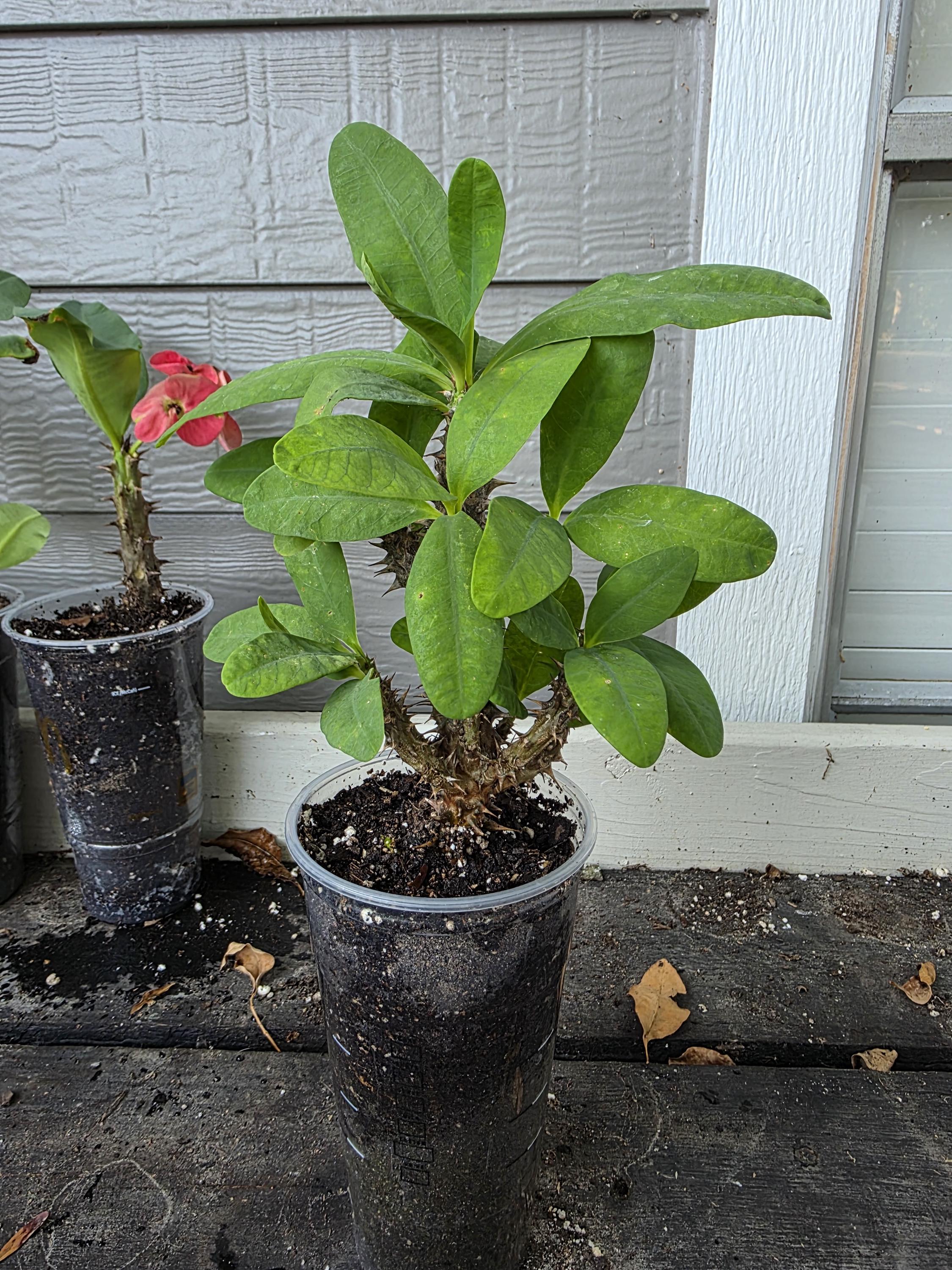 Beautiful Crown of Thorns with Large blooms. You will receive 12-16in plant with bare roots and some soil. This plant is drought tolerant. Full sun is needed, Use a well-draining potting mix containing perlite, and/or pine bark, soil must be drained before planting and weekly watering during hot weather.