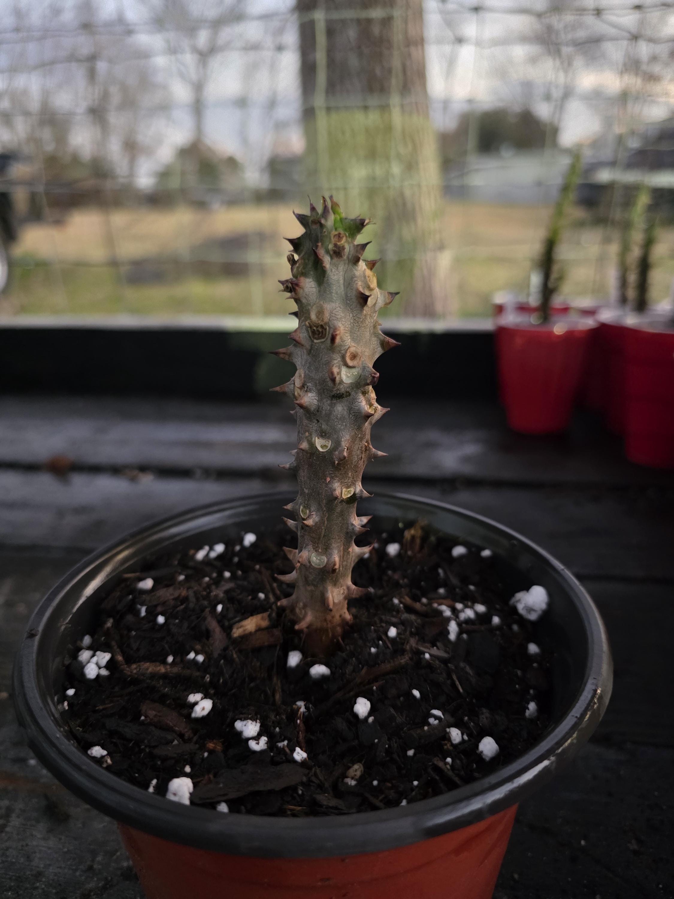 Beautiful Crown of Thorns!!! You will receive 4-7inch plant or larger with bare roots and some soil. This plant is drought tolerant. Full sun is needed, Use a well-draining potting mix containing perlite, and/or pine bark, soil must be drained before planting and weekly watering during hot weather.