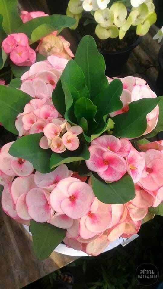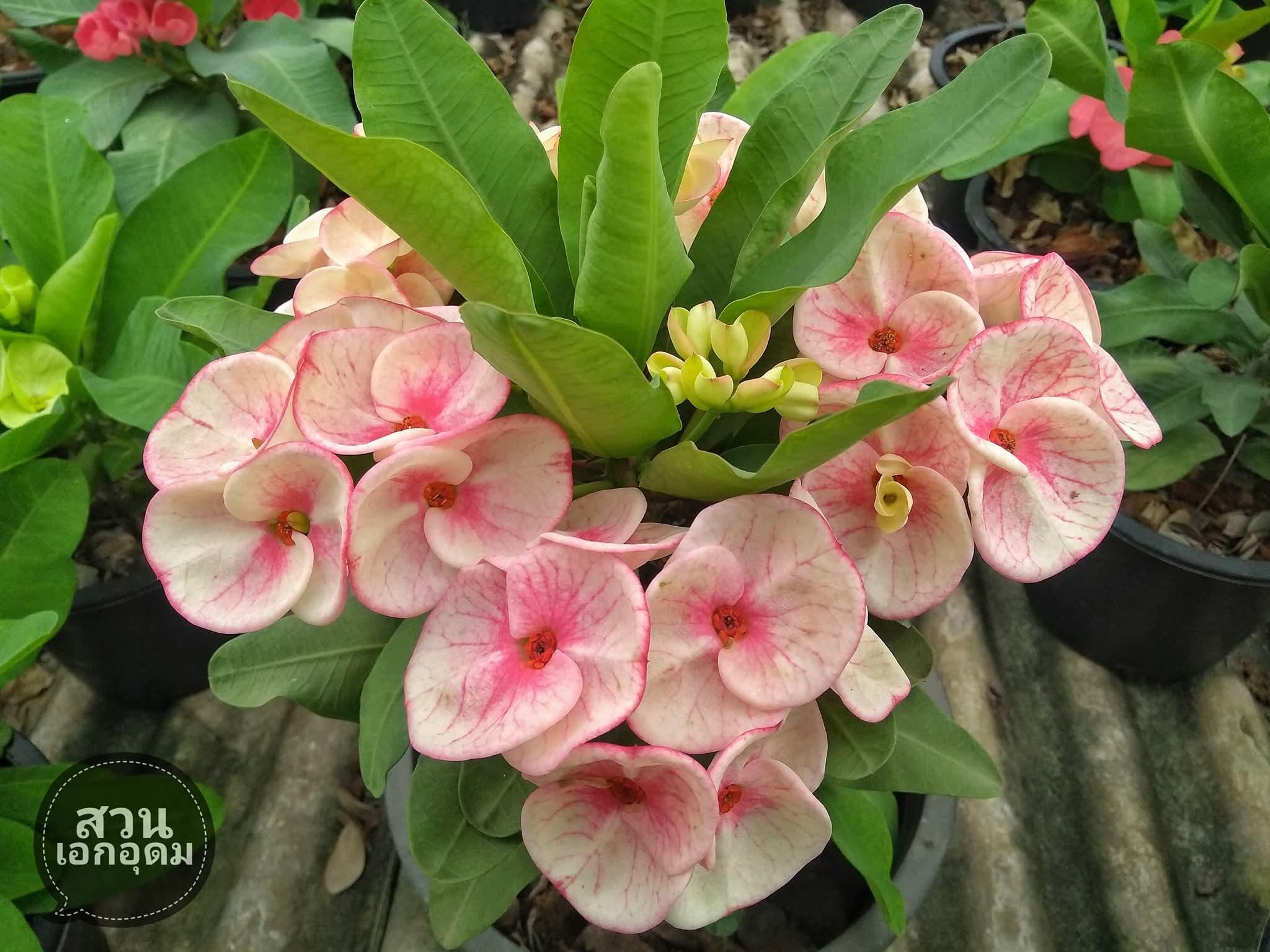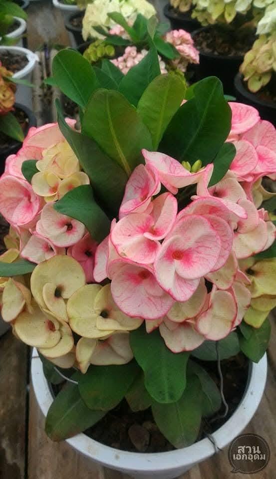 Beautiful Crown of Thorns with Large blooms. You will receive 3-6in plant or larger with bare roots and some soil. This plant is drought tolerant. Full sun is needed, Use a well-draining potting mix containing perlite, and/or pine bark, soil must be drained before planting and weekly watering during hot weather.