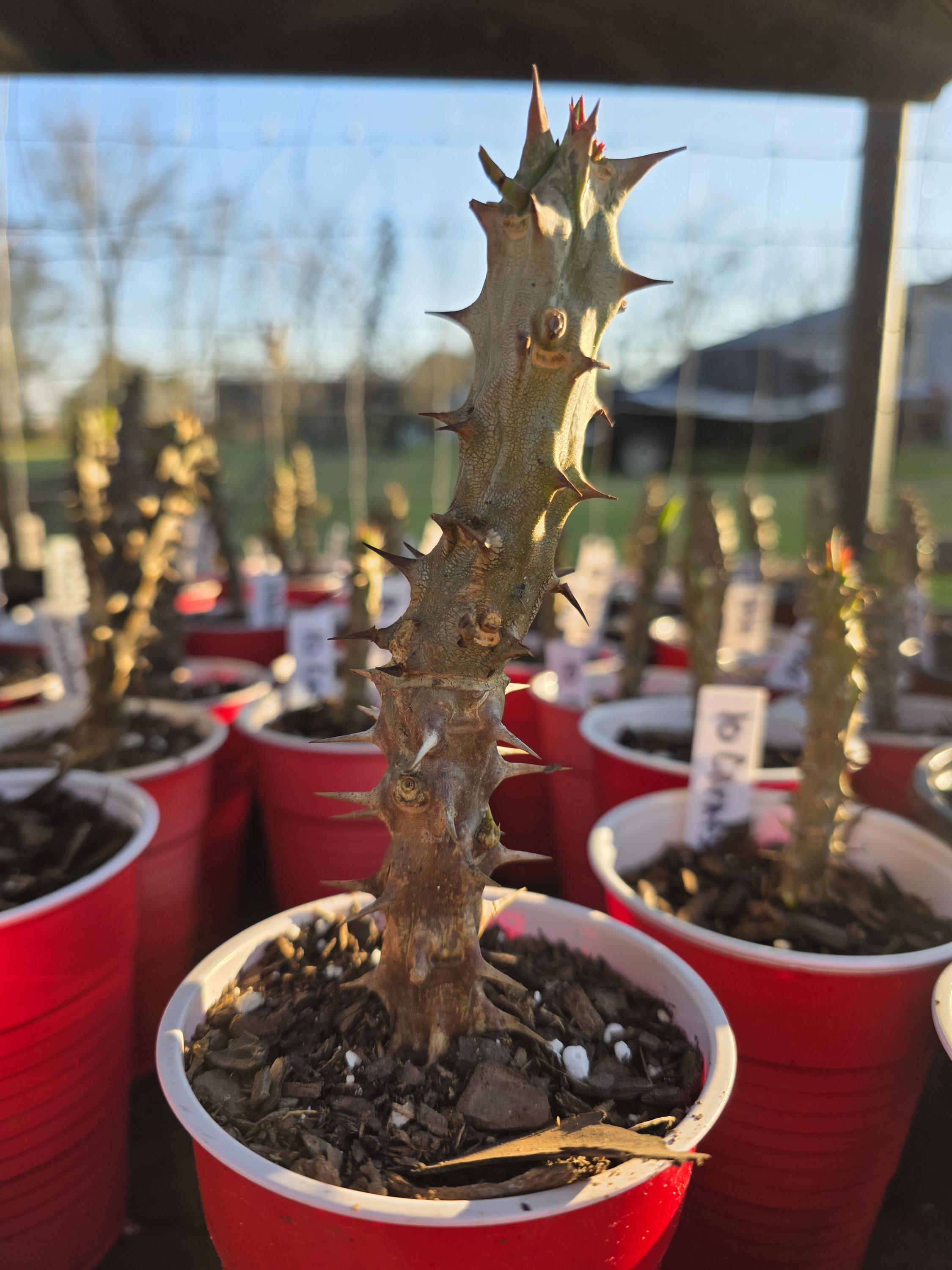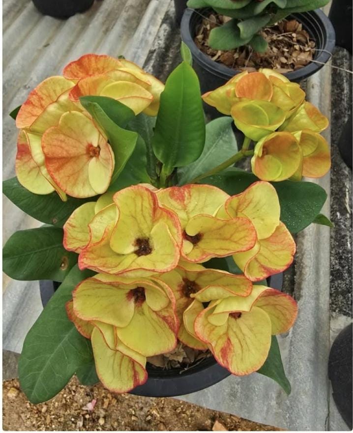 Beautiful Crown of Thorns!!! You will receive 4-7inch plant or larger with bare roots and some soil. This plant is drought tolerant. Full sun is needed, Use a well-draining potting mix containing perlite, and/or pine bark, soil must be drained before planting and weekly watering during hot weather.